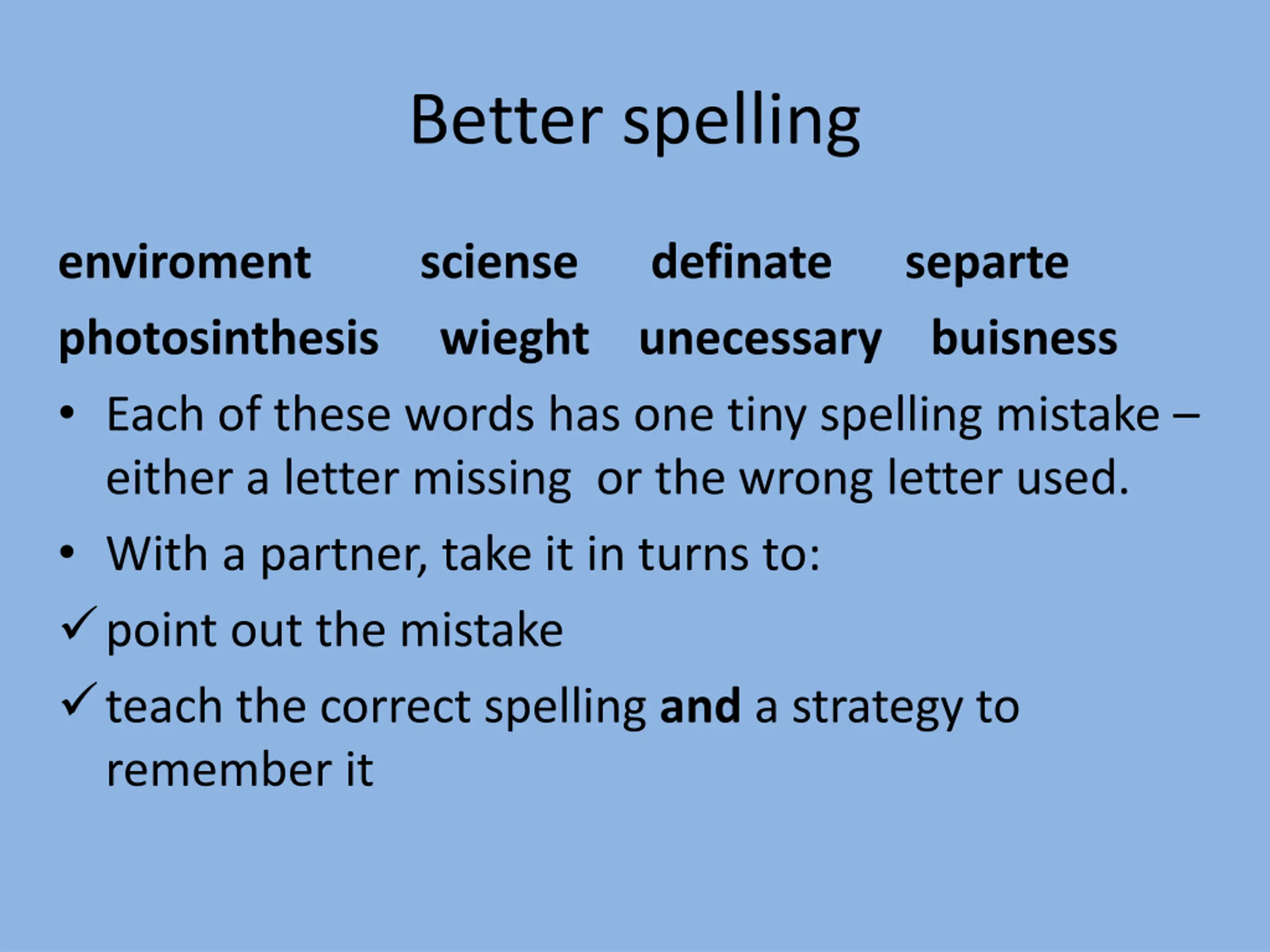 Better spelling enviroment photosinthesis Each of these words has one tiny spelling mistake either a letter missing or the wrong letter used. With a partner, take it in turns to: point out the mistake teach the correct spelling and a strategy to remember it sciense wieght definate unecessary separte buisness