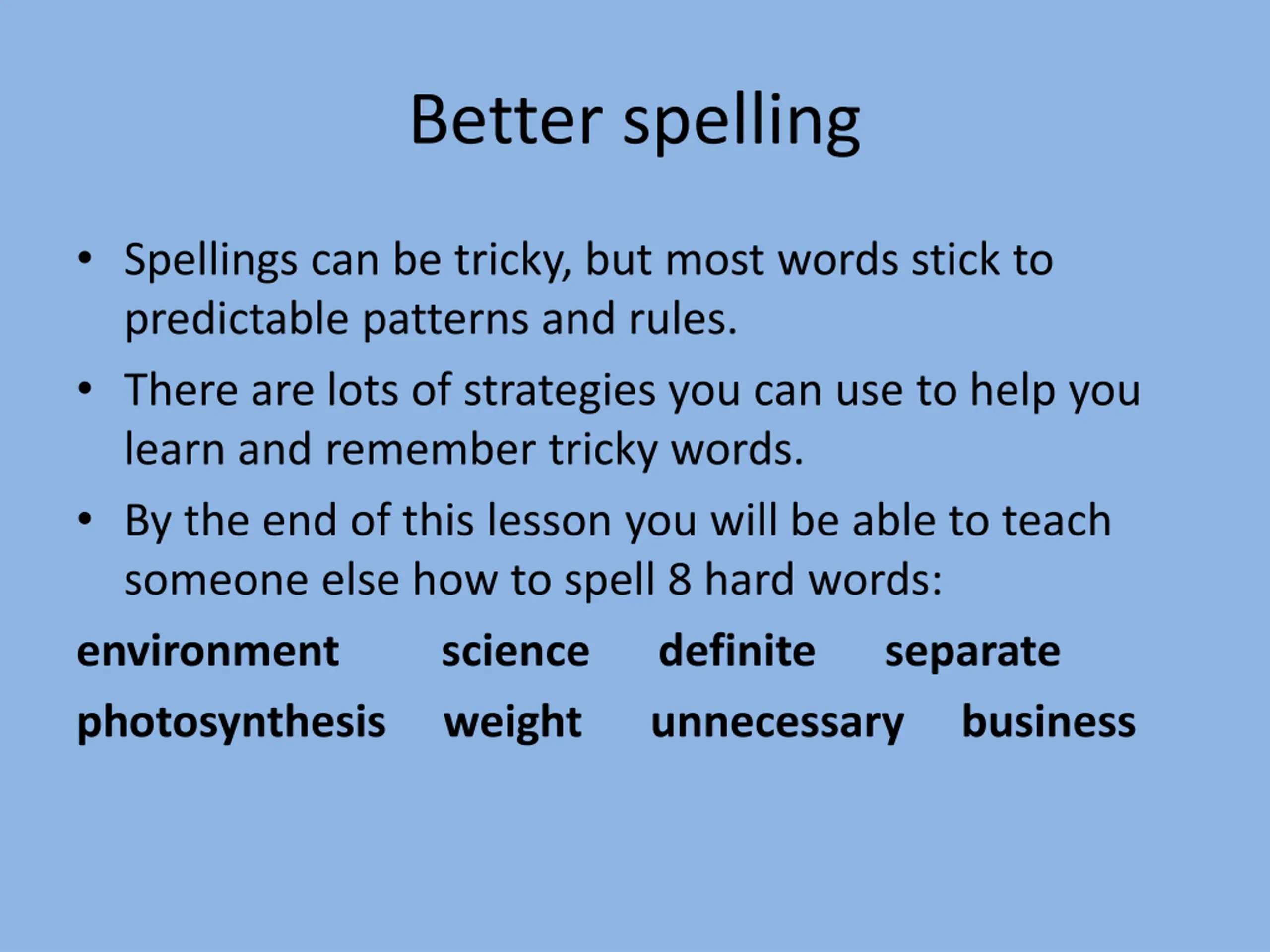 Better spelling Spellings can be tricky, but most words stick to predictable patterns and rules. There are lots of strategies you can use to help you learn and remember tricky words. By the end of this lesson you will be able to teach someone else how to spell 8 hard words: environment science definite separate photosynthesis weight unnecessary business