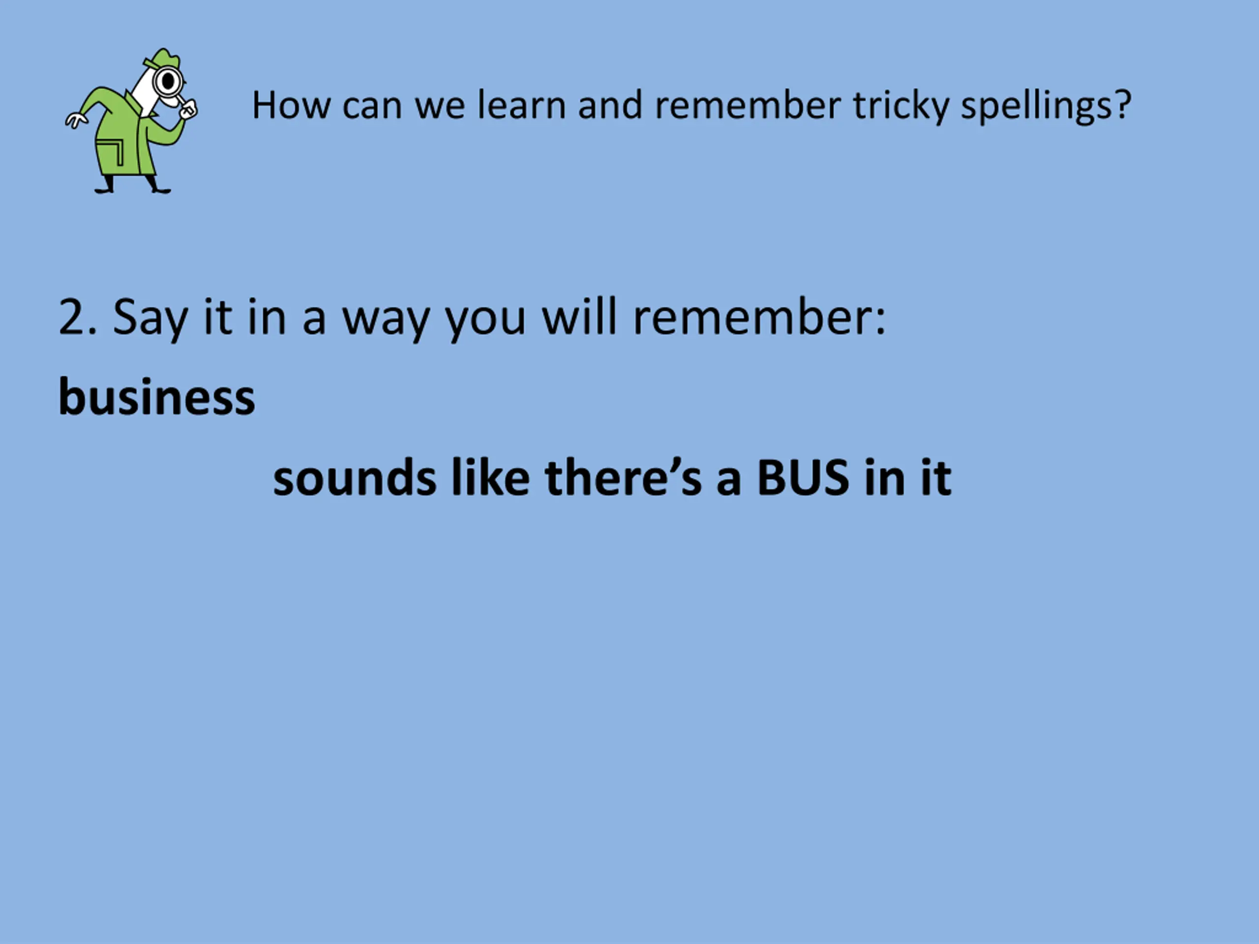How can we learn and remember tricky spellings? 2. Say it in a way you will remember: business sounds like there s a BUS in it