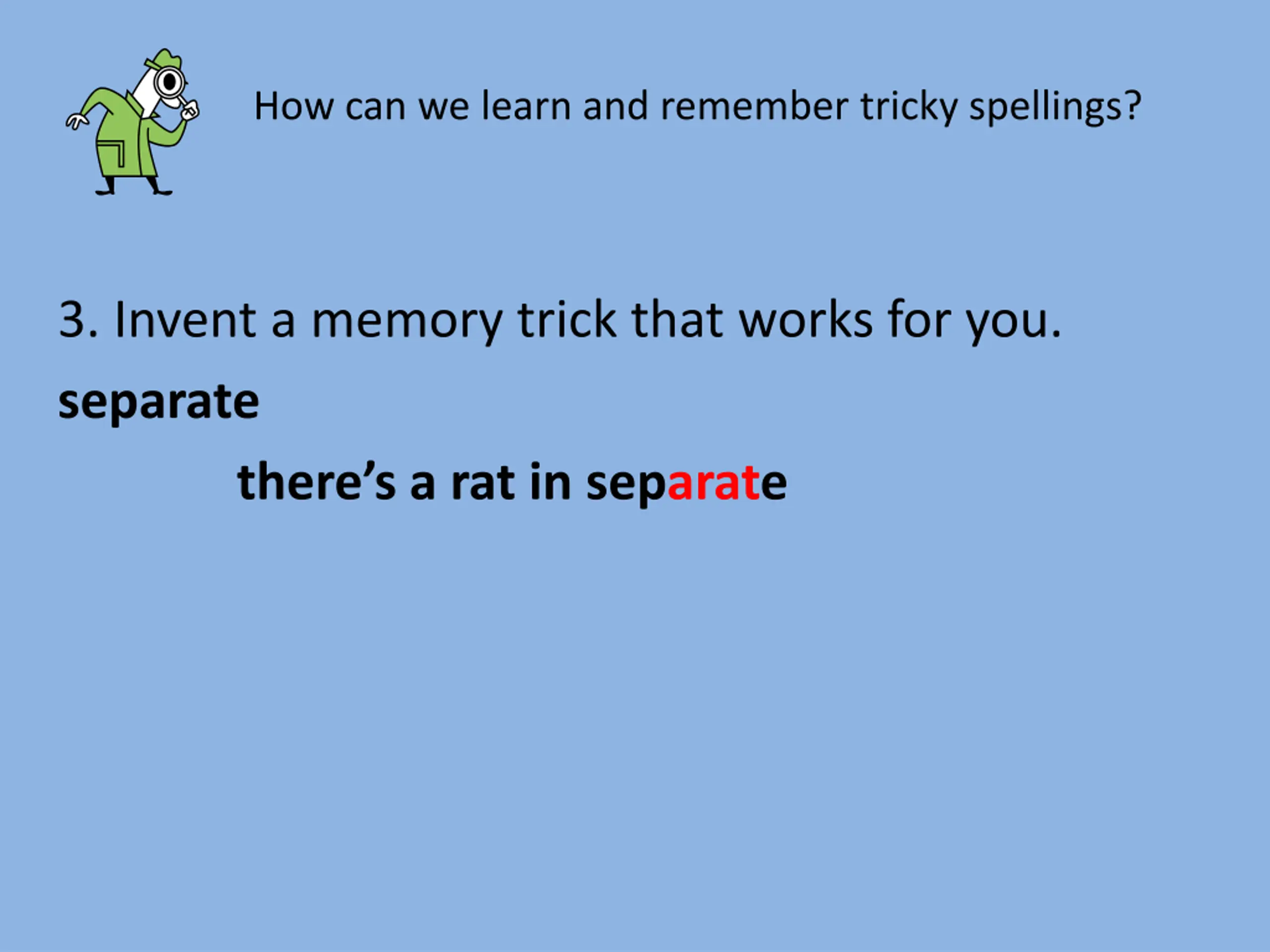 How can we learn and remember tricky spellings? 3. Invent a memory trick that works for you. separate there s a rat in separate