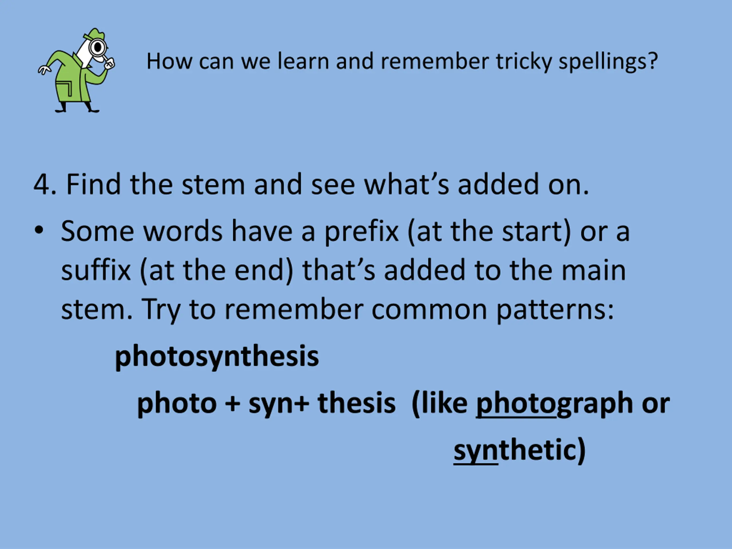 How can we learn and remember tricky spellings? 4. Find the stem and see what s added on. Some words have a prefix (at the start) or a suffix (at the end) that s added to the main stem. Try to remember common patterns: photosynthesis photo + syn+ thesis (like photograph or synthetic)