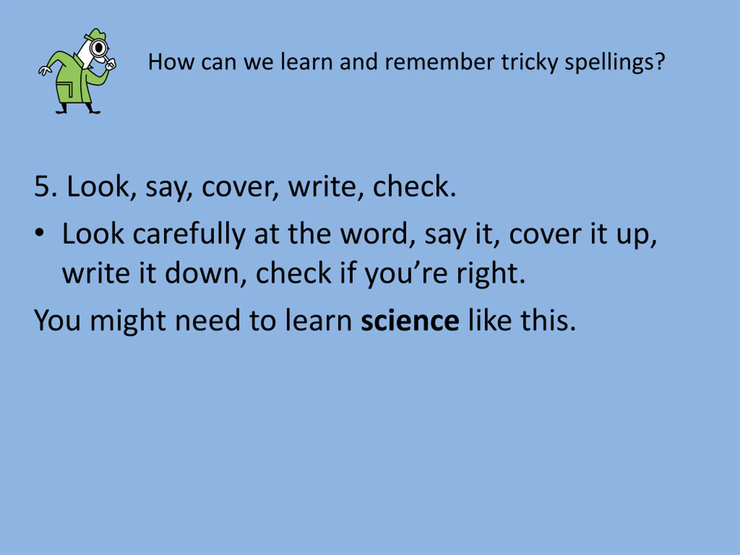 How can we learn and remember tricky spellings? 5. Look, say, cover, write, check. Look carefully at the word, say it, cover it up, write it down, check if you re right. You might need to learn science like this.