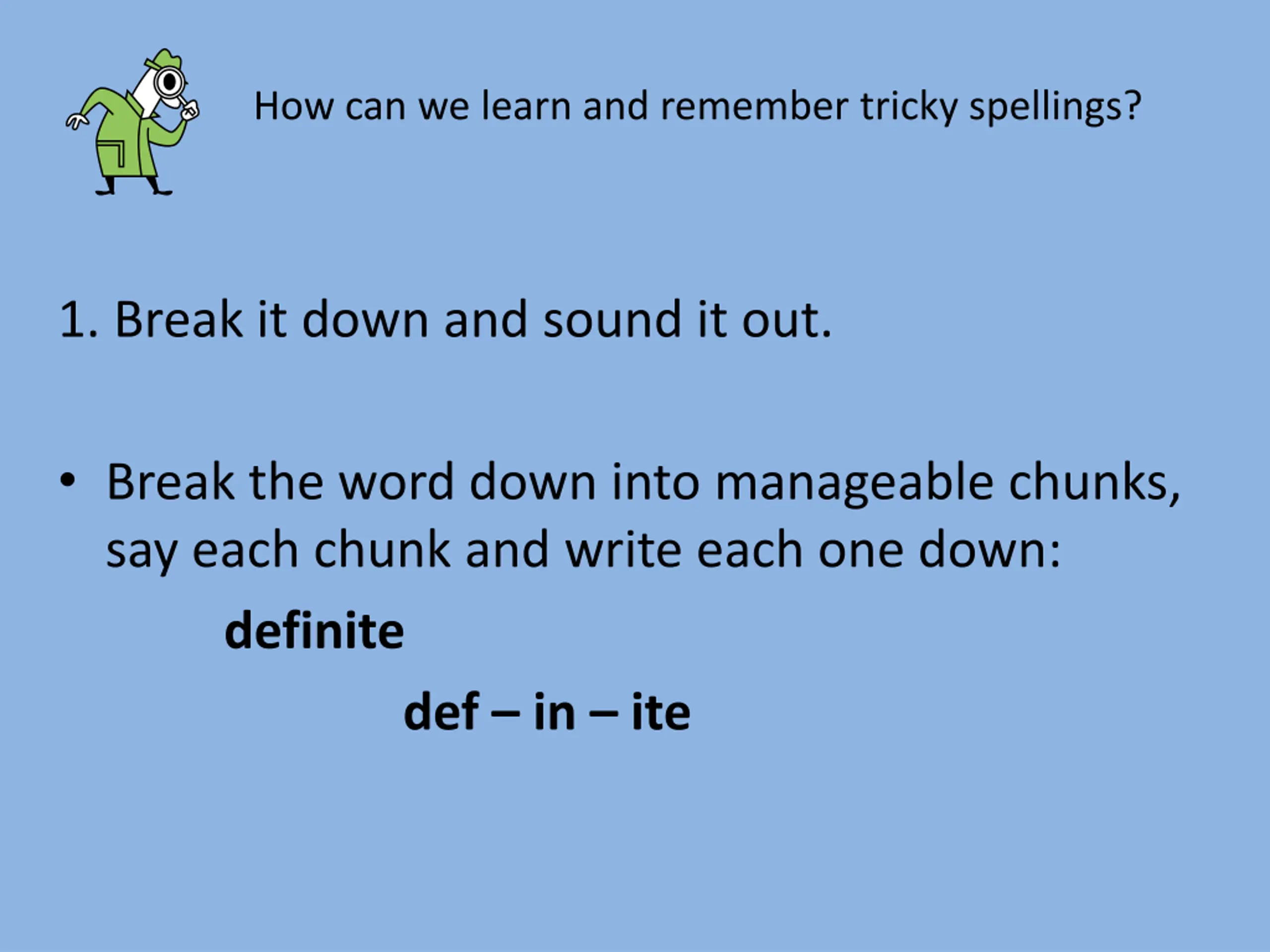 How can we learn and remember tricky spellings? 1. Break it down and sound it out. Break the word down into manageable chunks, say each chunk and write each one down: definite def in ite