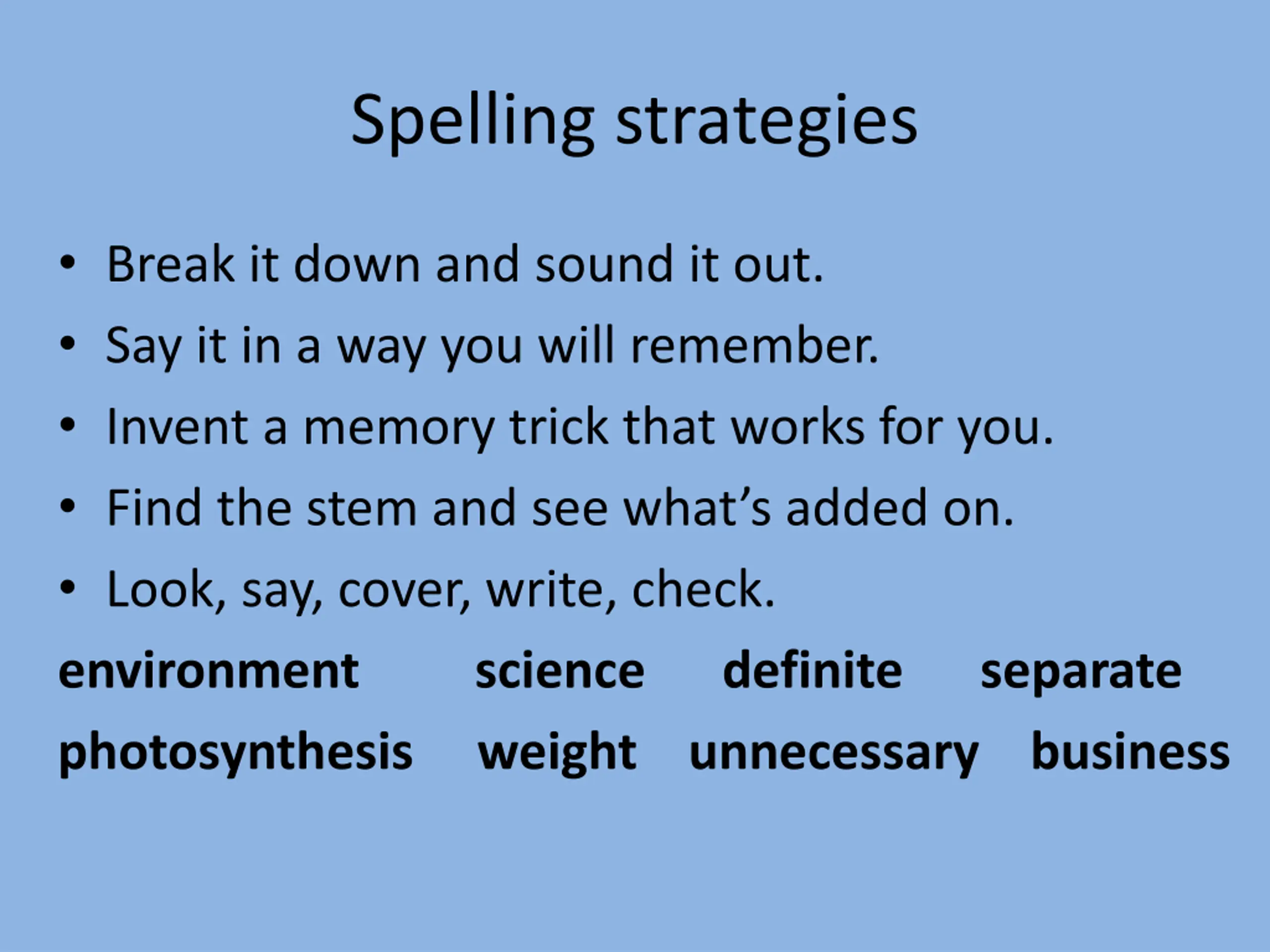 Spelling strategies Break it down and sound it out. Say it in a way you will remember. Invent a memory trick that works for you. Find the stem and see what s added on. Look, say, cover, write, check. environment science definite separate photosynthesis weight unnecessary business