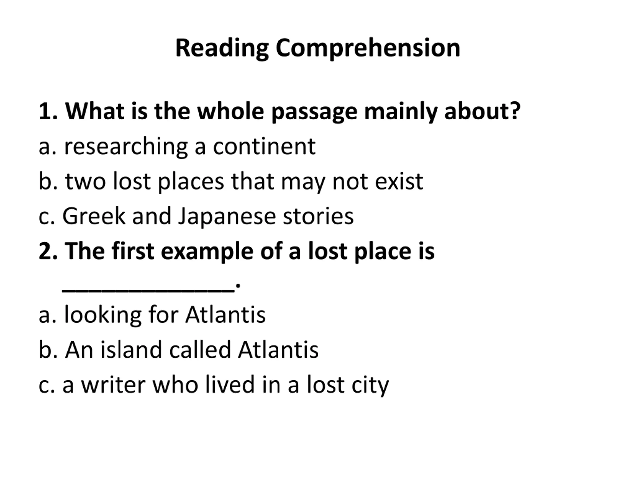 Reading Comprehension 1. What is the whole passage mainly about? a. researching a continent b. two lost places that may not exist c. Greek and Japanese stories 2. The first example of a lost place is _____________. a. looking for Atlantis b. An island called Atlantis c. a writer who lived in a lost city