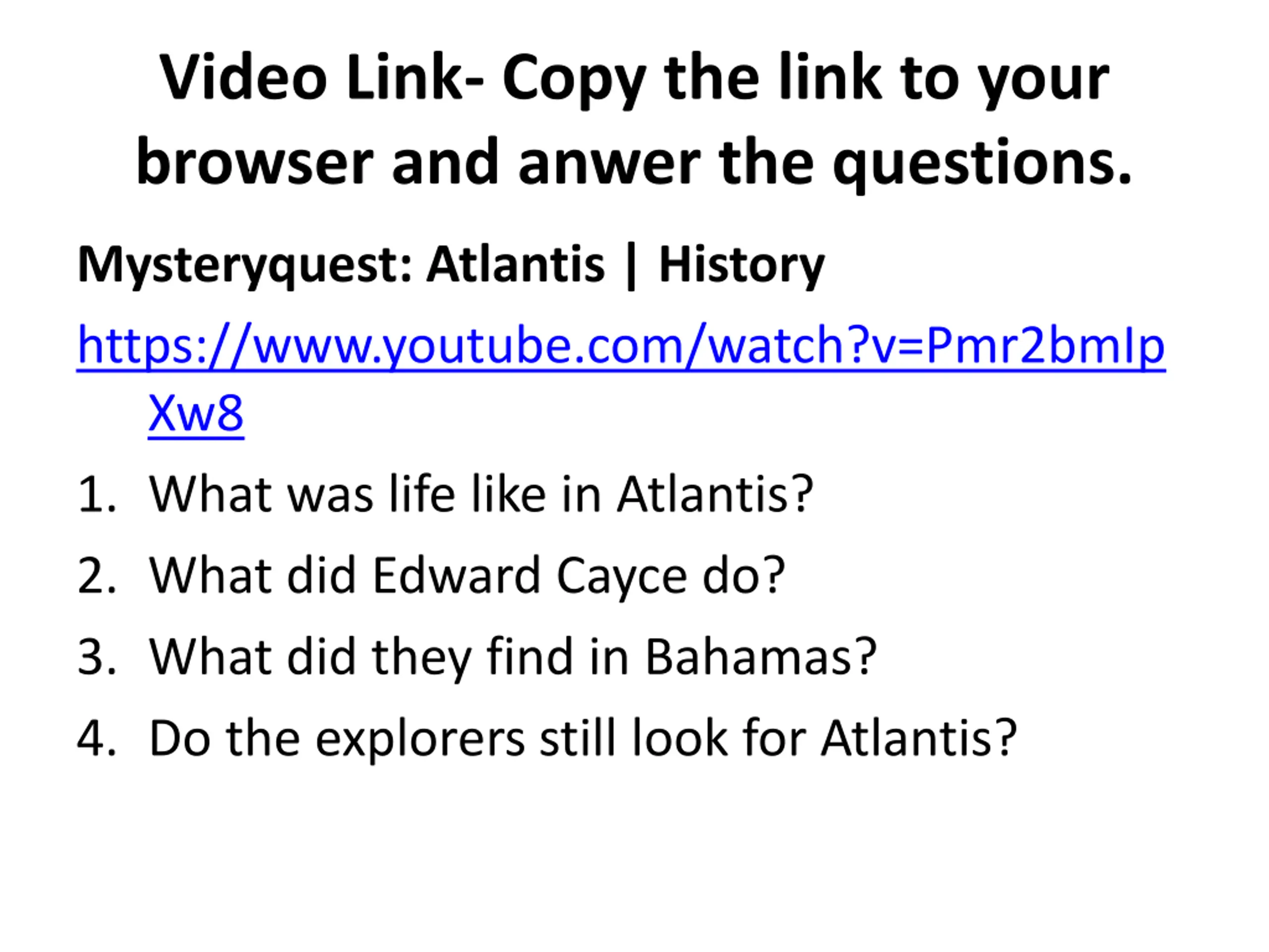 Video Link- Copy the link to your browser and anwer the questions. Mysteryquest: Atlantis | History https://www.youtube.com/watch?v=Pmr2bmIp Xw8 1. What was life like in Atlantis? 2. What did Edward Cayce do? 3. What did they find in Bahamas? 4. Do the explorers still look for Atlantis?