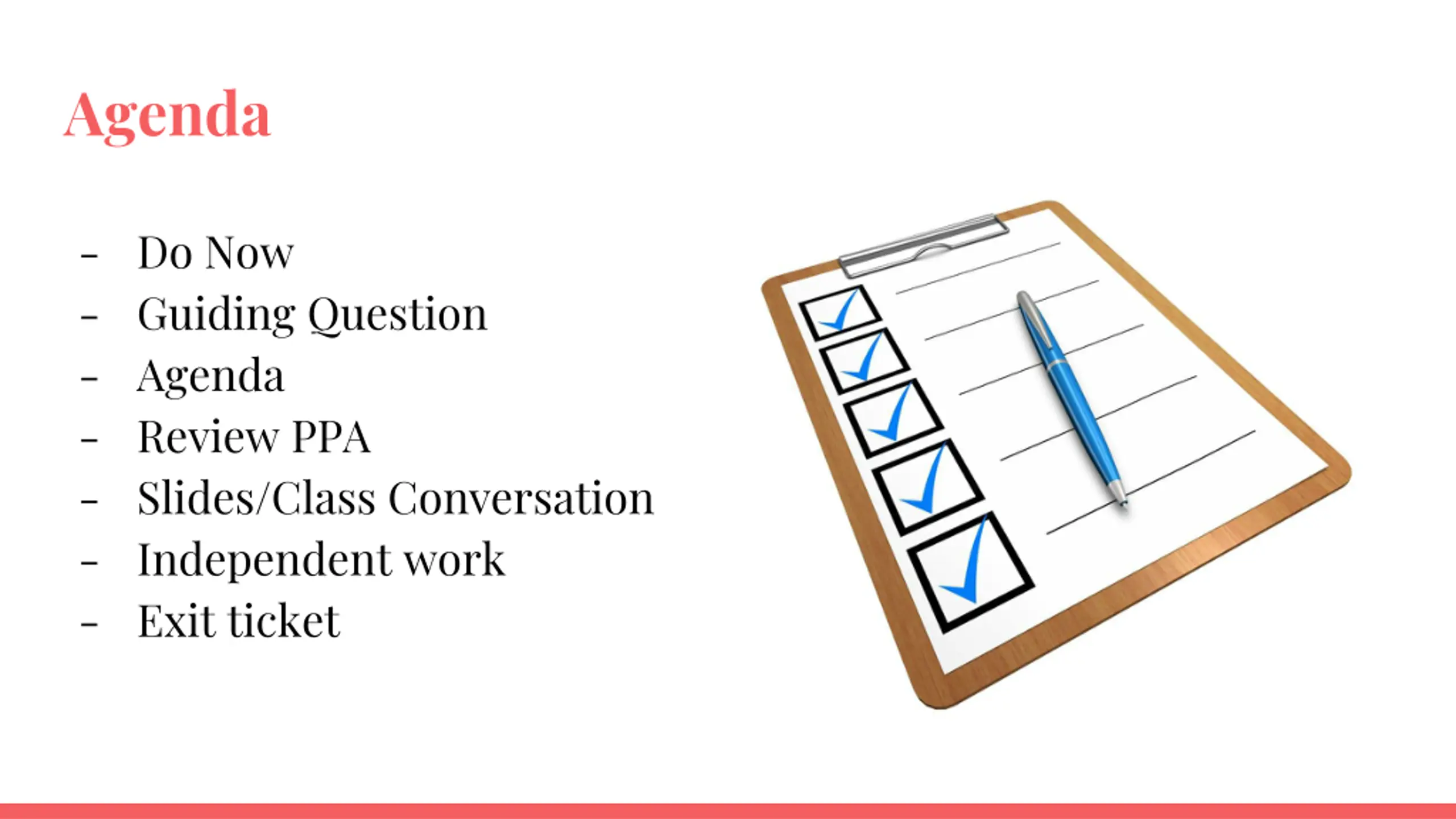 Agenda - Do Now - Guiding Question - Agenda - Review PPA - Slides/Class Conversation - Independent work - Exit ticket