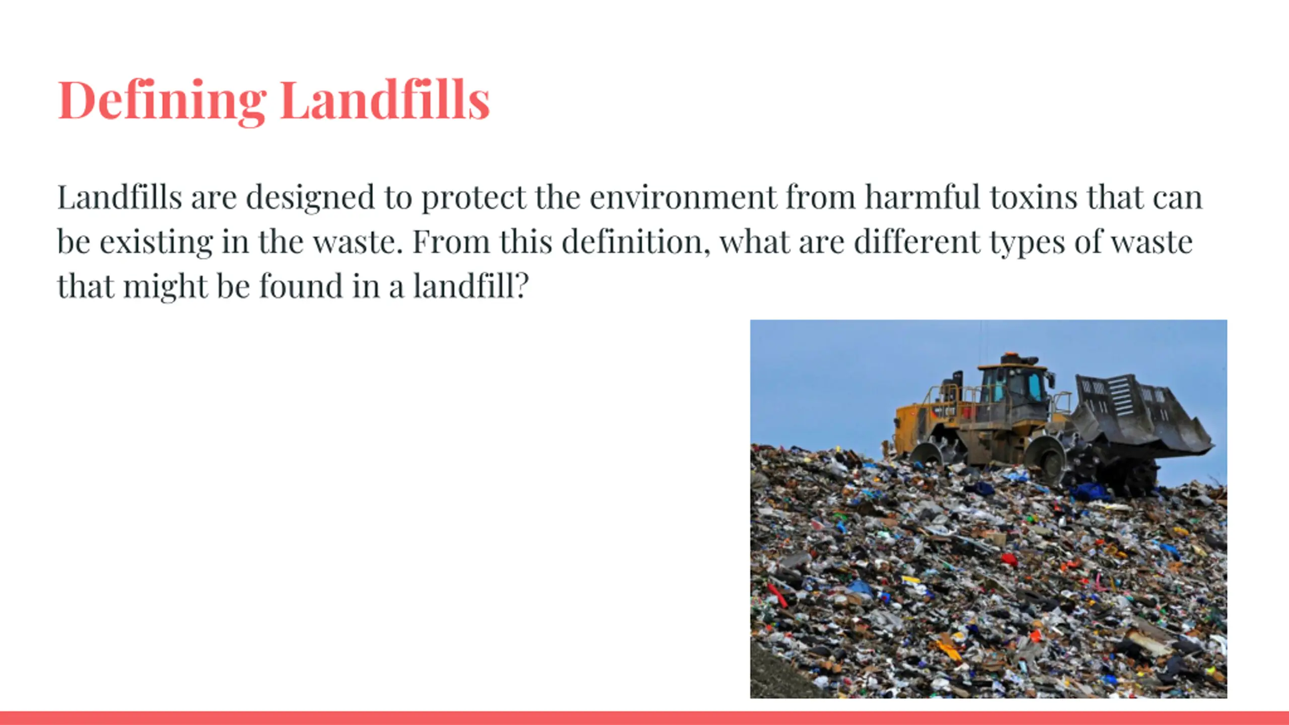Defining Landfills Landfills are designed to protect the environment from harmful toxins that can be existing in the waste. From this definition, what are different types of waste that might be found in a landfill?