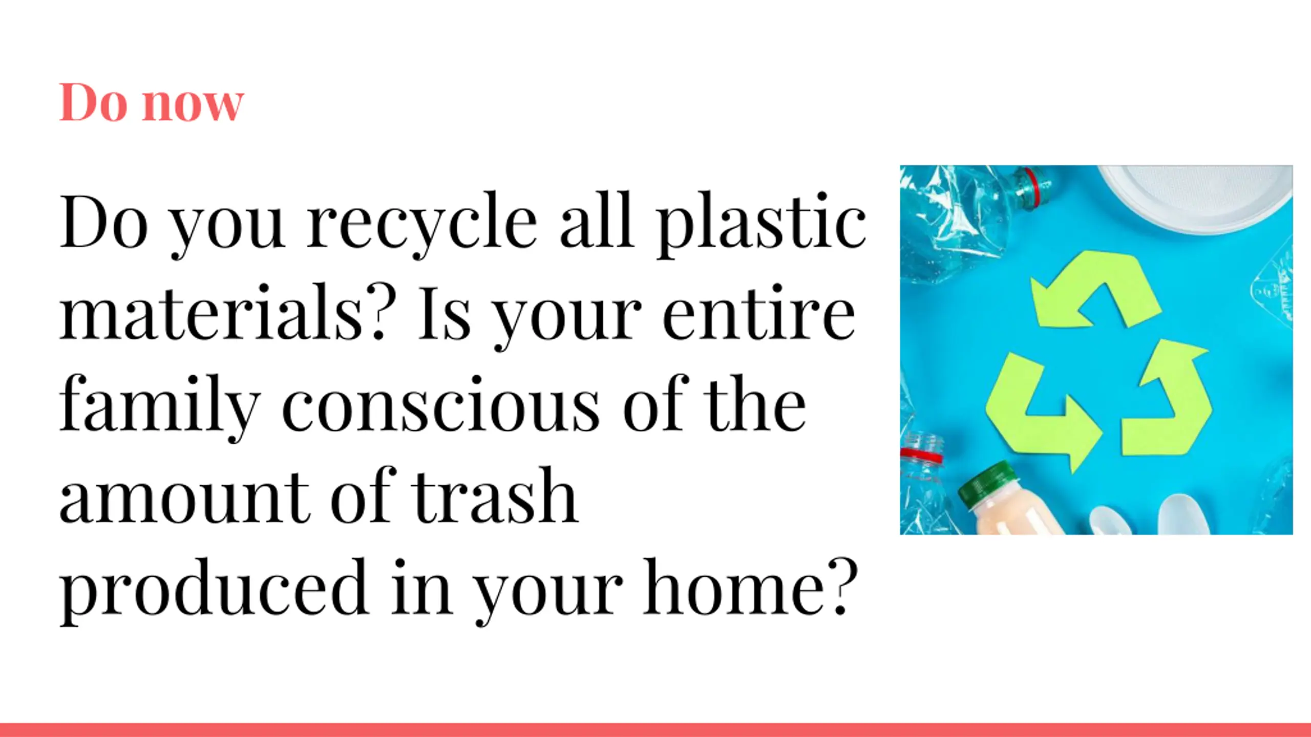 Do now Do you recycle all plastic materials? Is your entire family conscious of the amount of trash produced in your home?