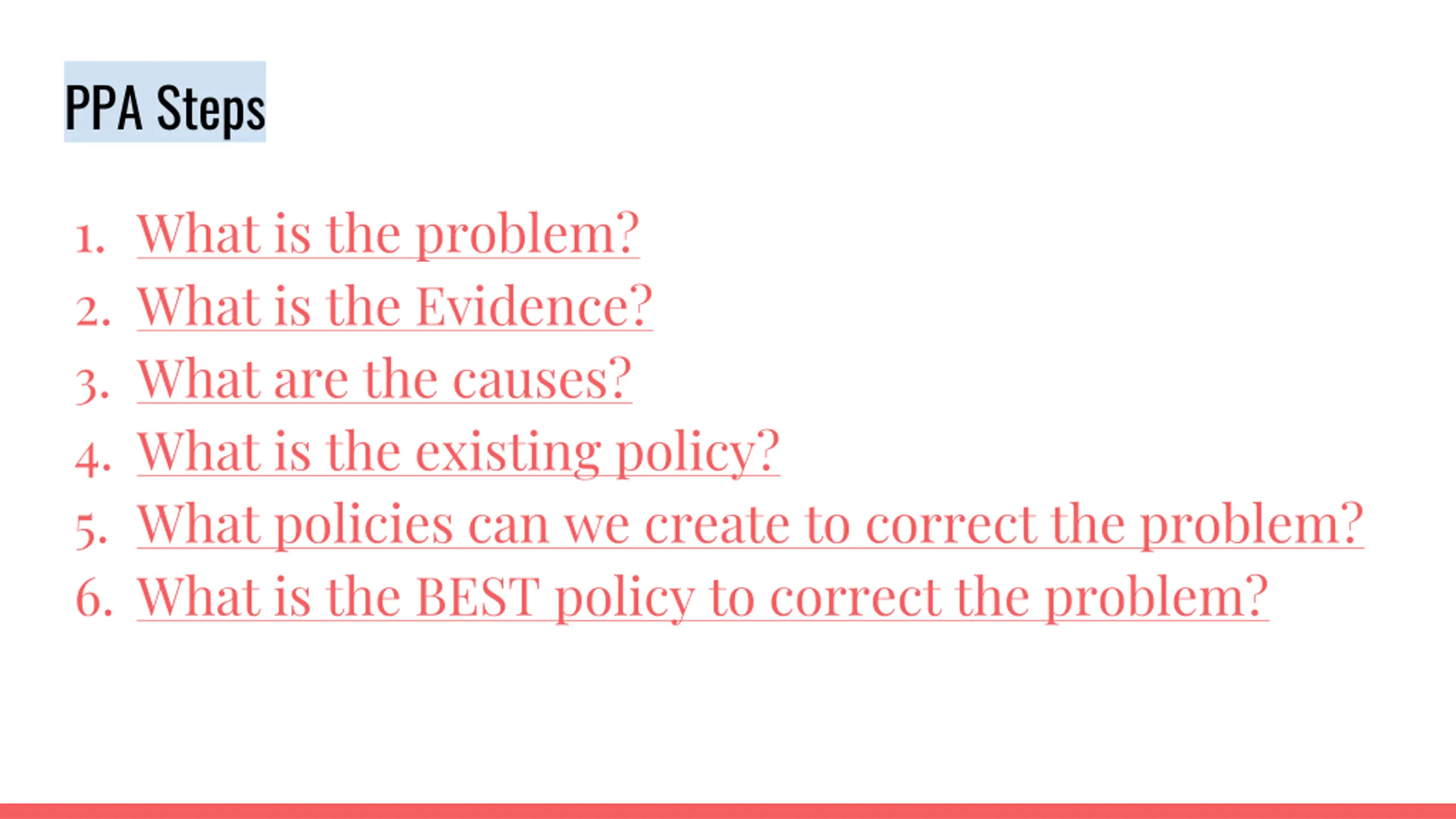 PPA Steps 1. What is the problem? 2. What is the Evidence? 3. What are the causes? 4. What is the existing policy? 5. What policies can we create to correct the problem? 6. What is the BEST policy to correct the problem?