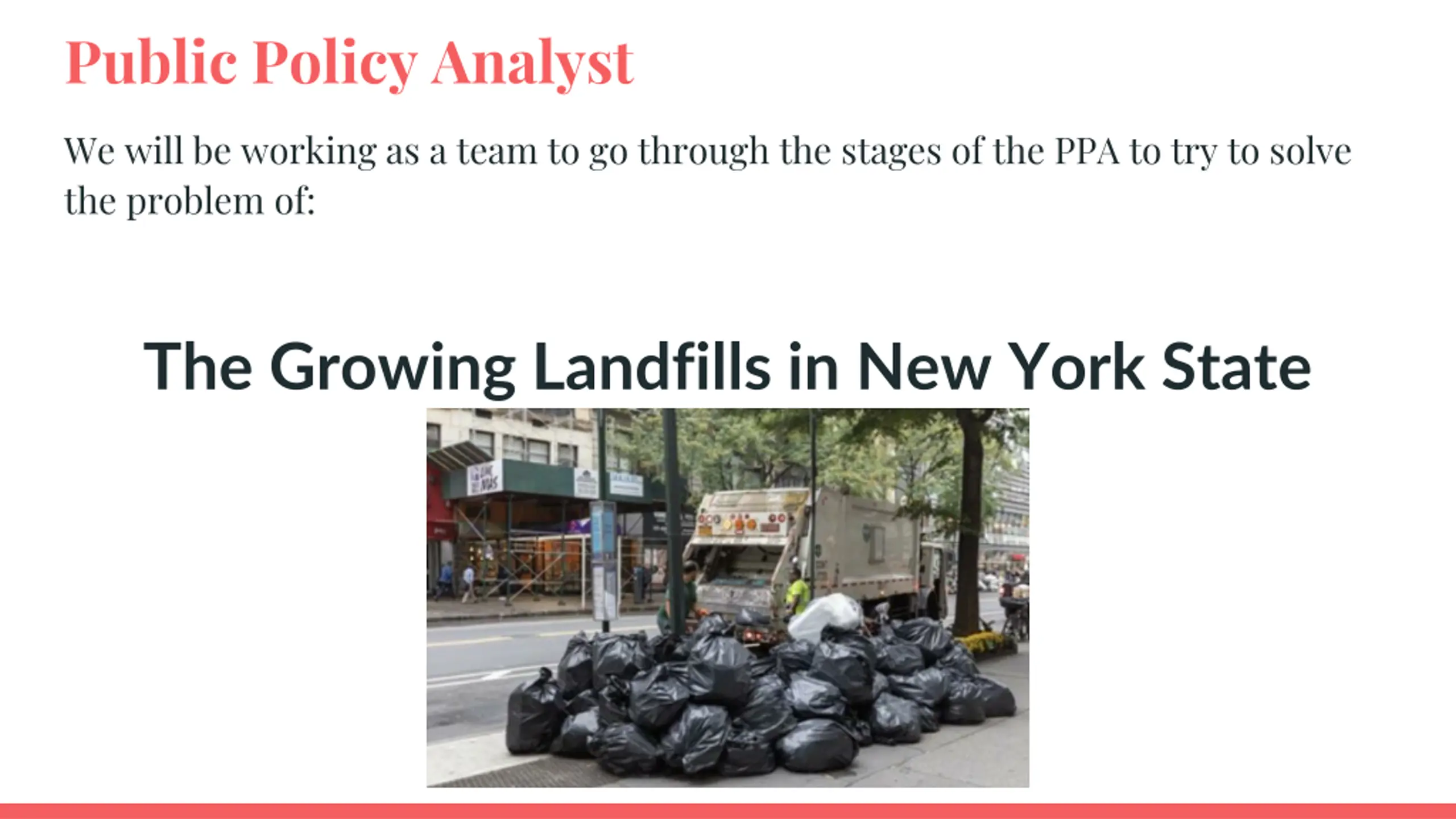 Public Policy Analyst We will be working as a team to go through the stages of the PPA to try to solve the problem of: The Growing Landfills in New York State