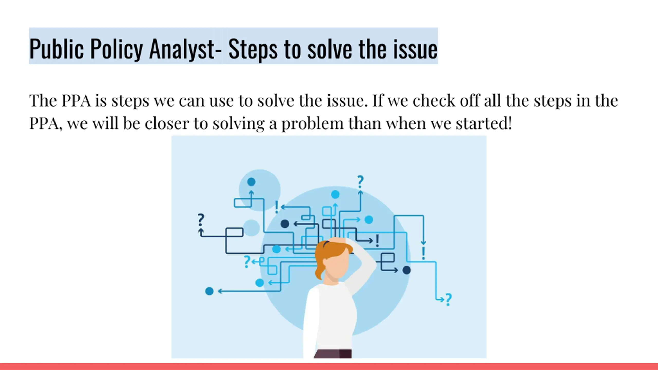 Public Policy Analyst- Steps to solve the issue The PPA is steps we can use to solve the issue. If we check off all the steps in the PPA, we will be closer to solving a problem than when we started!