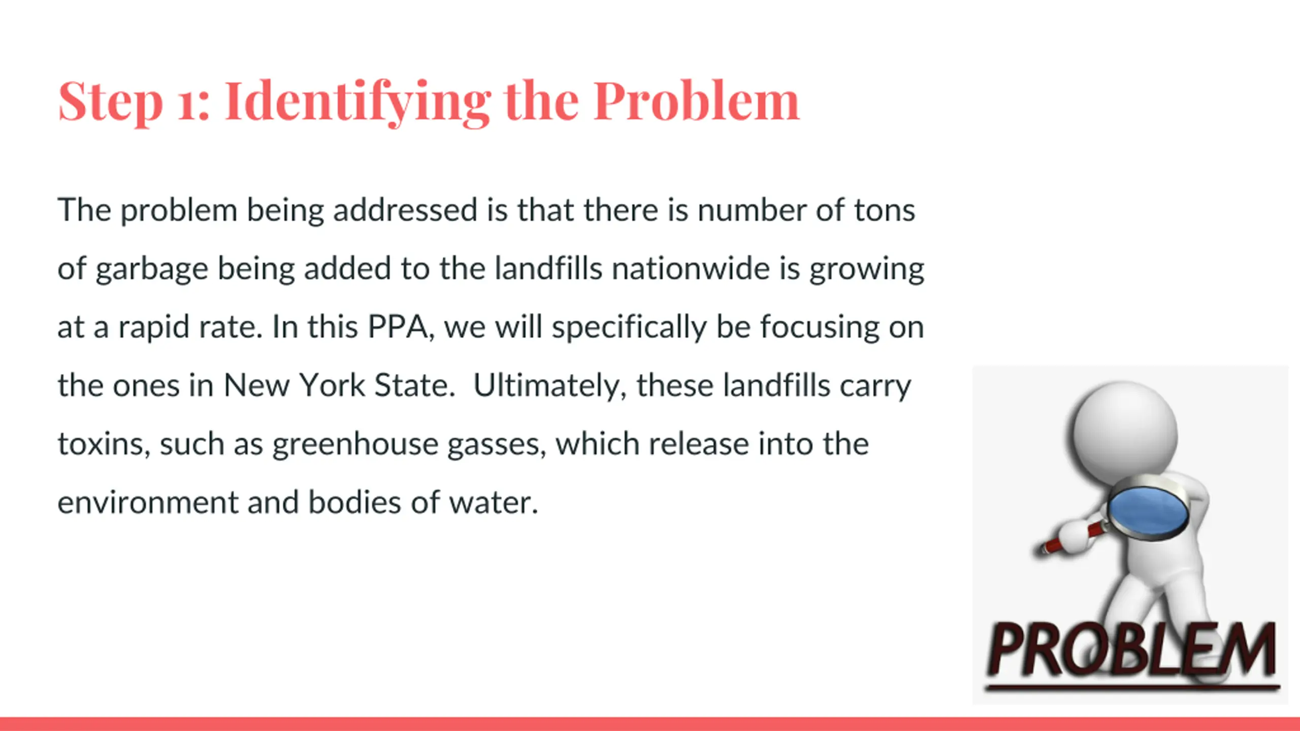 Step 1: Identifying the Problem The problem being addressed is that there is number of tons of garbage being added to the landfills nationwide is growing at a rapid rate. In this PPA, we will specifically be focusing on the ones in New York State. Ultimately, these landfills carry toxins, such as greenhouse gasses, which release into the environment and bodies of water.