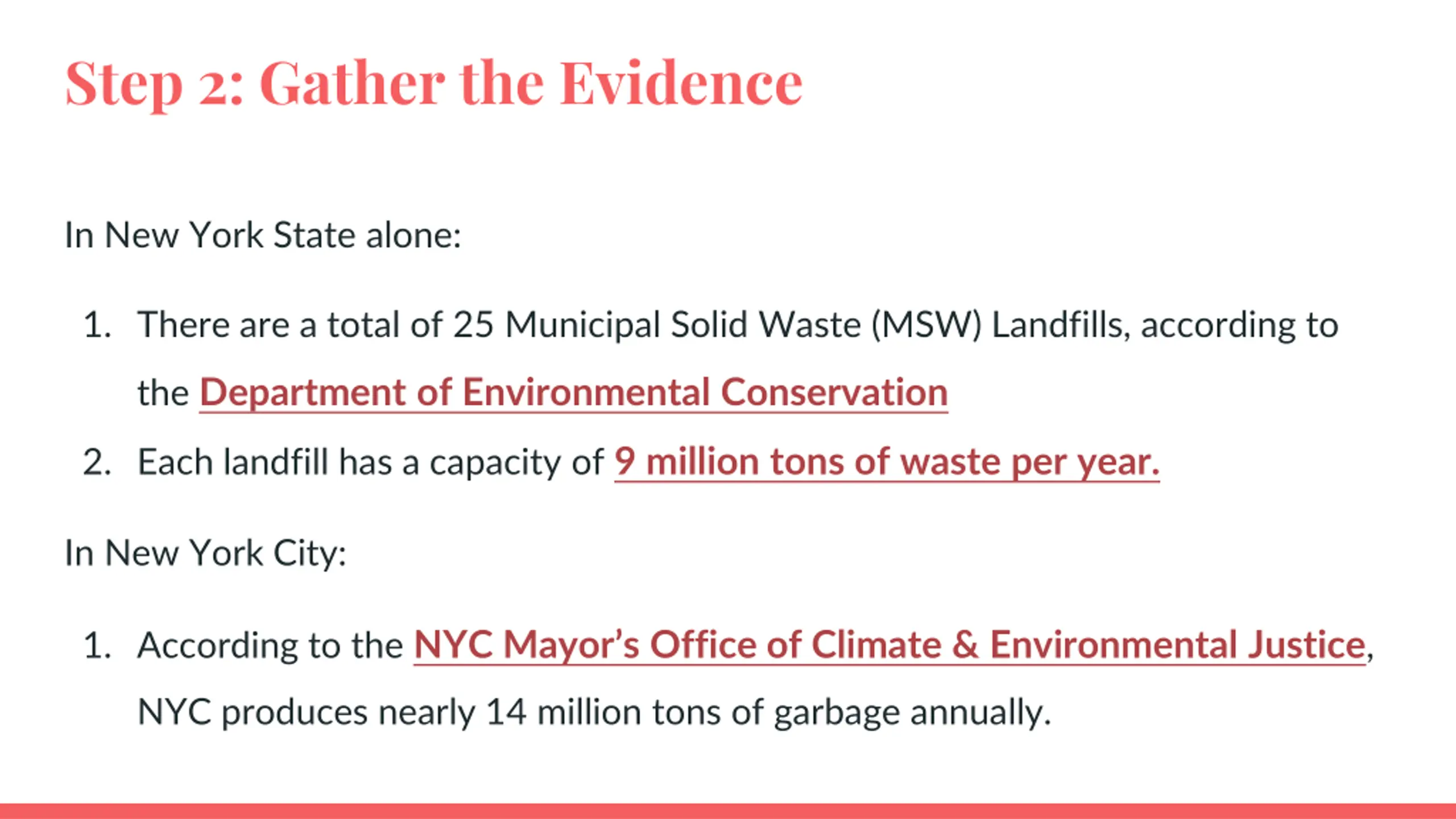 Step 2: Gather the Evidence In New York State alone: 1. There are a total of 25 Municipal Solid Waste (MSW) Landfills, according to the Department of Environmental Conservation 2. Each landfill has a capacity of 9 million tons of waste per year. In New York City: 1. According to the NYC Mayor s Office of Climate & Environmental Justice, NYC produces nearly 14 million tons of garbage annually.