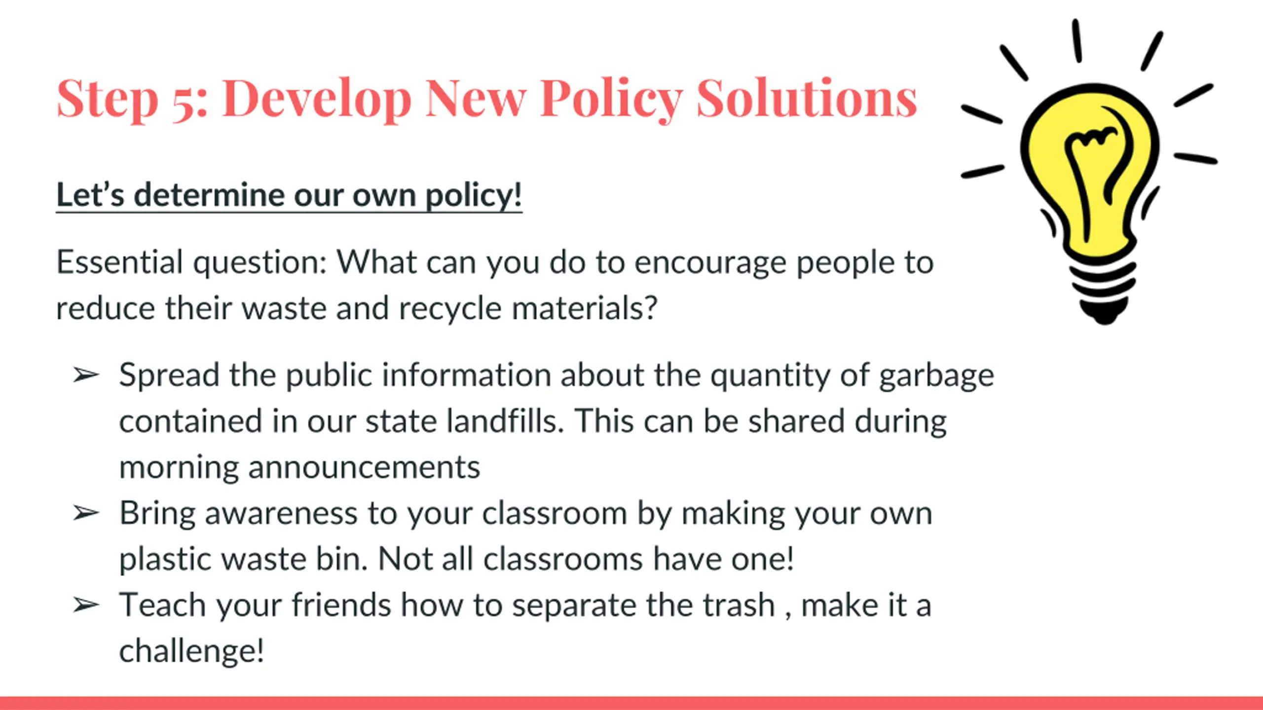 Step 5: Develop New Policy Solutions Let s determine our own policy! Essential question: What can you do to encourage people to reduce their waste and recycle materials? Spread the public information about the quantity of garbage contained in our state landfills. This can be shared during morning announcements Bring awareness to your classroom by making your own plastic waste bin. Not all classrooms have one! Teach your friends how to separate the trash , make it a challenge!