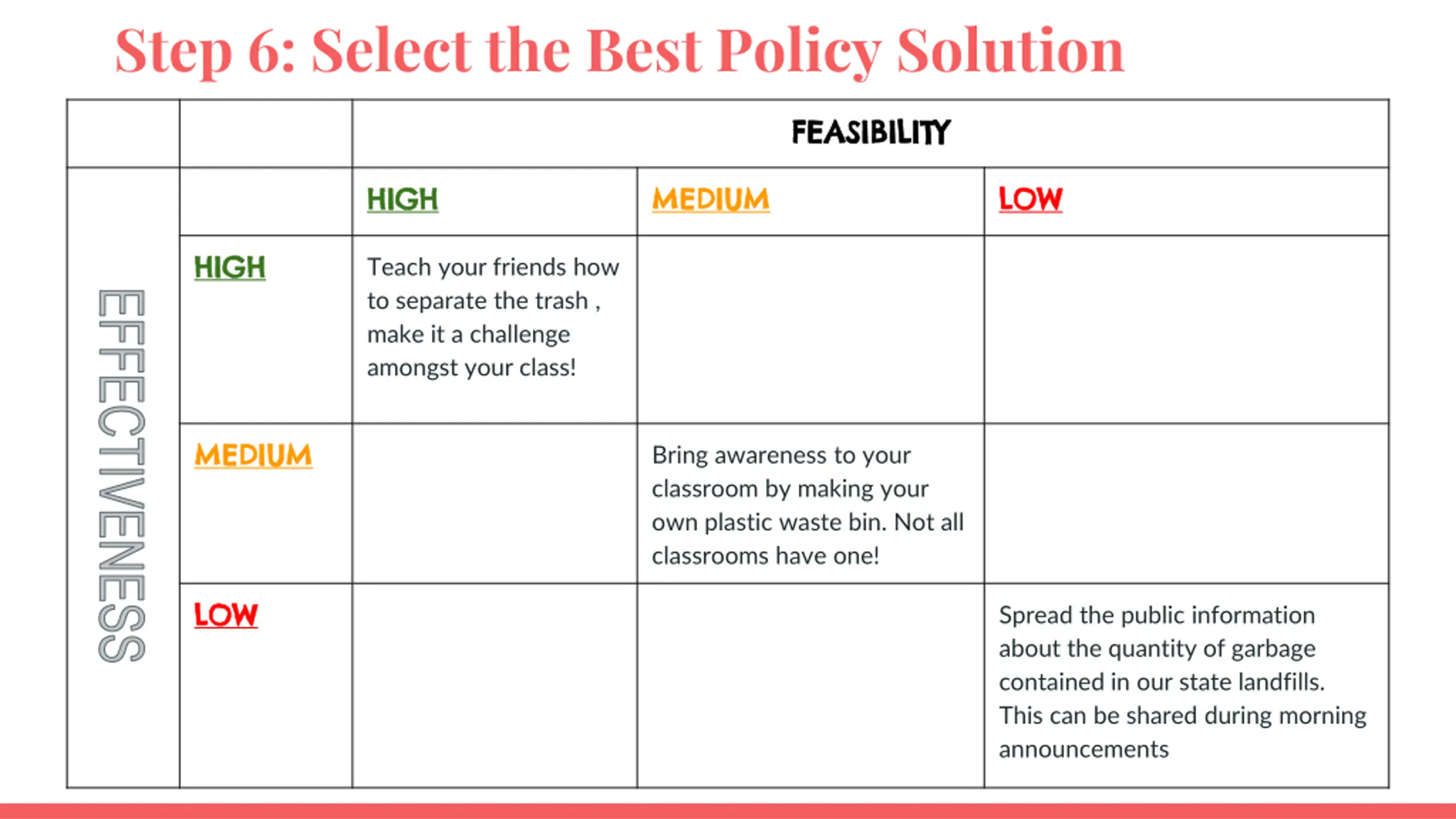 Step 6: Select the Best Policy Solution FEASIBILITY FEASIBILITY HIGH HIGH MEDIUM MEDIUM LOW LOW HIGH HIGH Teach your friends how to separate the trash , make it a challenge amongst your class! EFFECTIVENESS MEDIUM MEDIUM Bring awareness to your classroom by making your own plastic waste bin. Not all classrooms have one! LOW LOW Spread the public information about the quantity of garbage contained in our state landfills. This can be shared during morning announcements