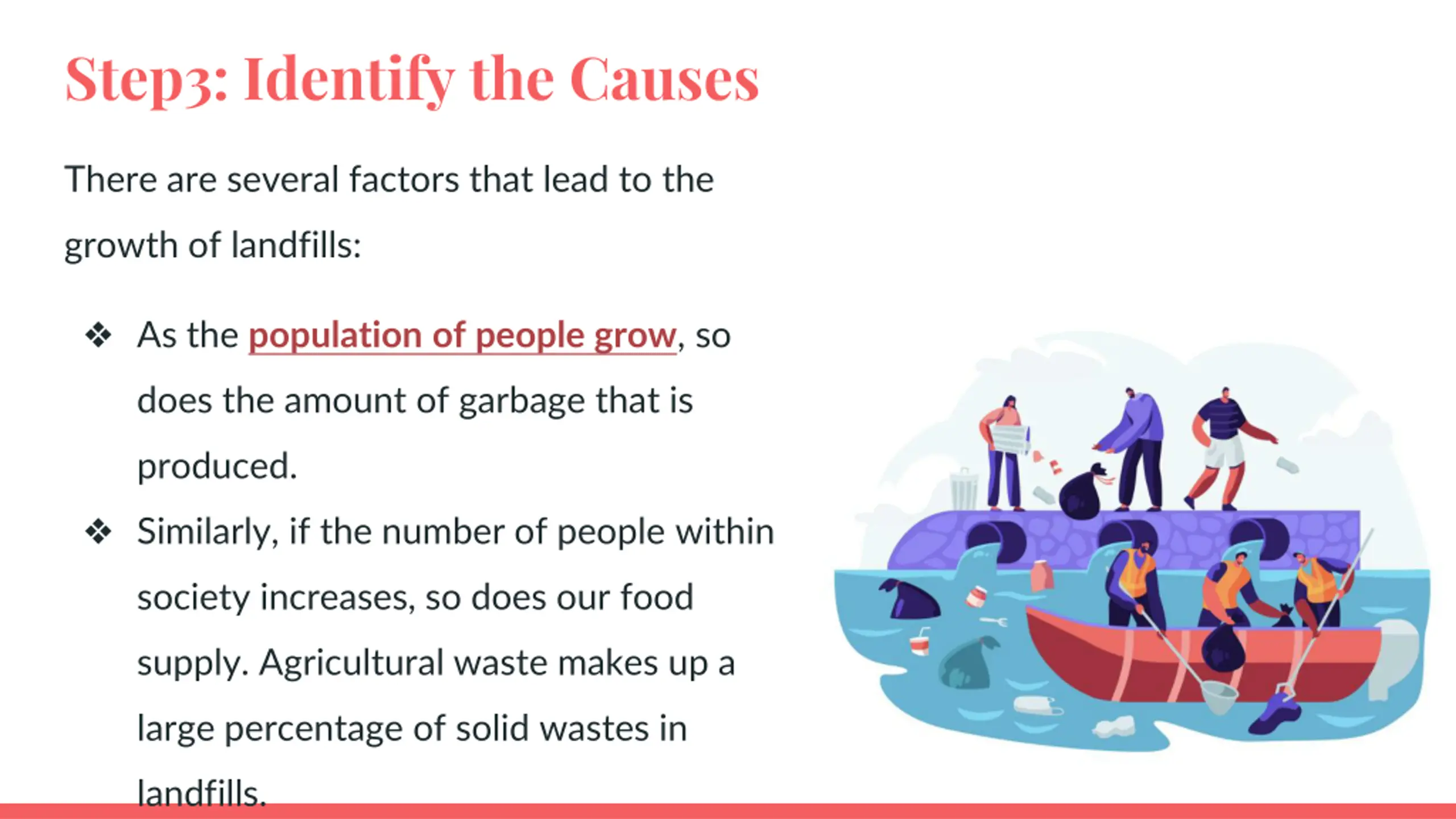 Step3: Identify the Causes There are several factors that lead to the growth of landfills: As the population of people grow, so does the amount of garbage that is produced. Similarly, if the number of people within society increases, so does our food supply. Agricultural waste makes up a large percentage of solid wastes in landfills.