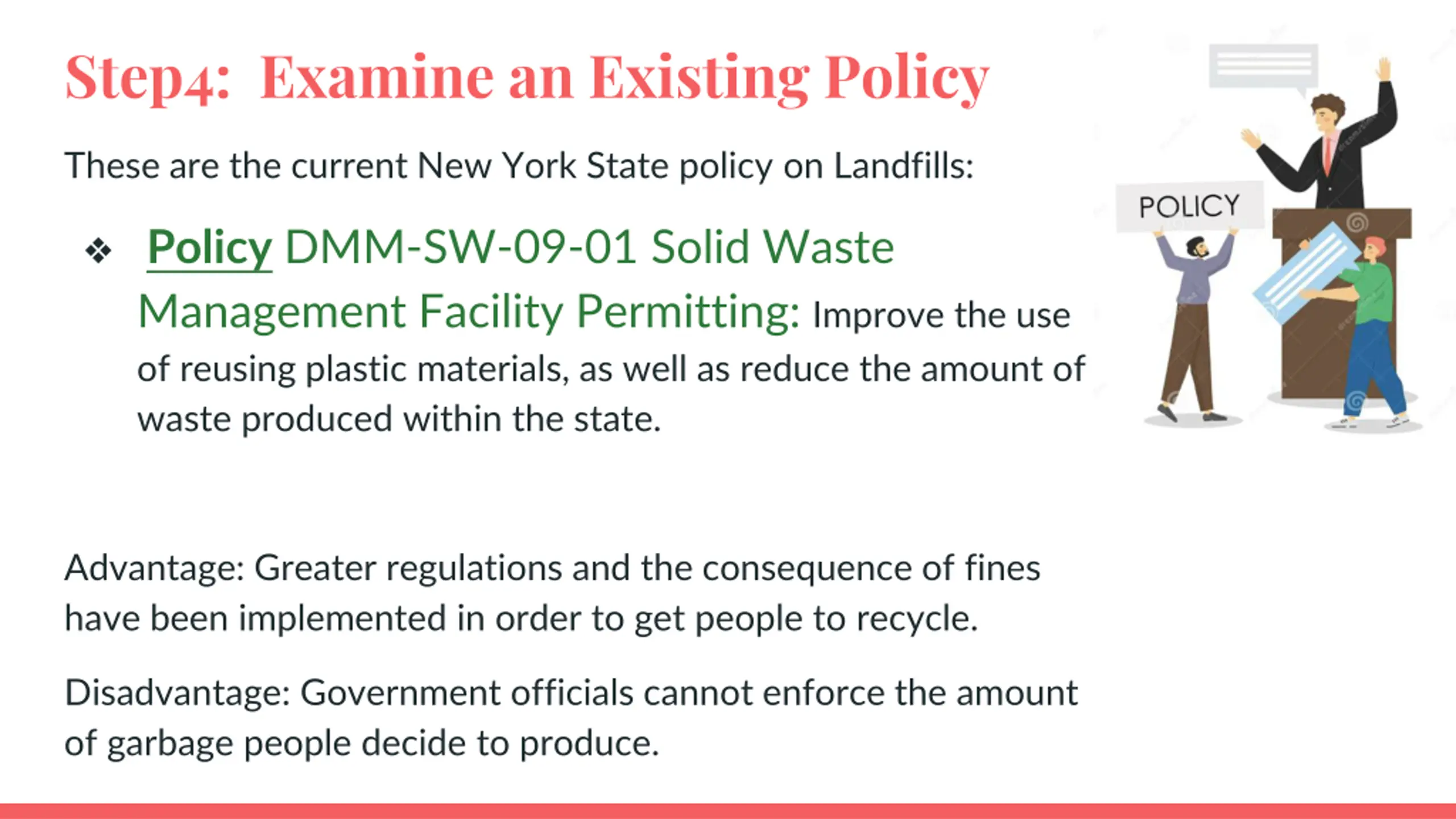 Step4: Examine an Existing Policy These are the current New York State policy on Landfills: Policy DMM-SW-09-01 Solid Waste Management Facility Permitting: Improve the use of reusing plastic materials, as well as reduce the amount of waste produced within the state. Advantage: Greater regulations and the consequence of fines have been implemented in order to get people to recycle. Disadvantage: Government officials cannot enforce the amount of garbage people decide to produce.