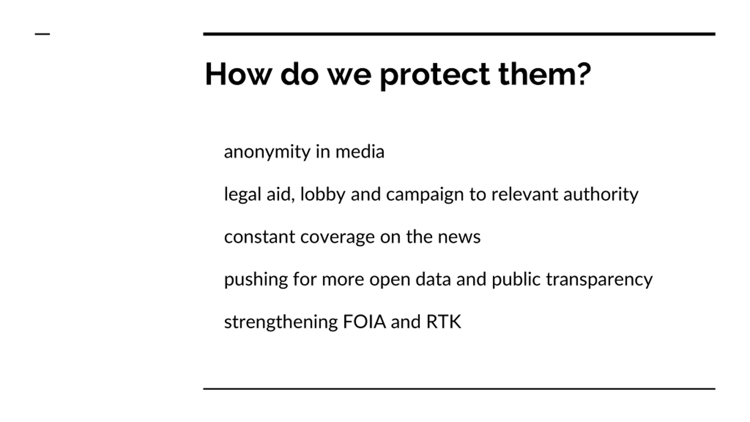 How do we protect them? anonymity in media legal aid, lobby and campaign to relevant authority constant coverage on the news pushing for more open data and public transparency strengthening FOIA and RTK