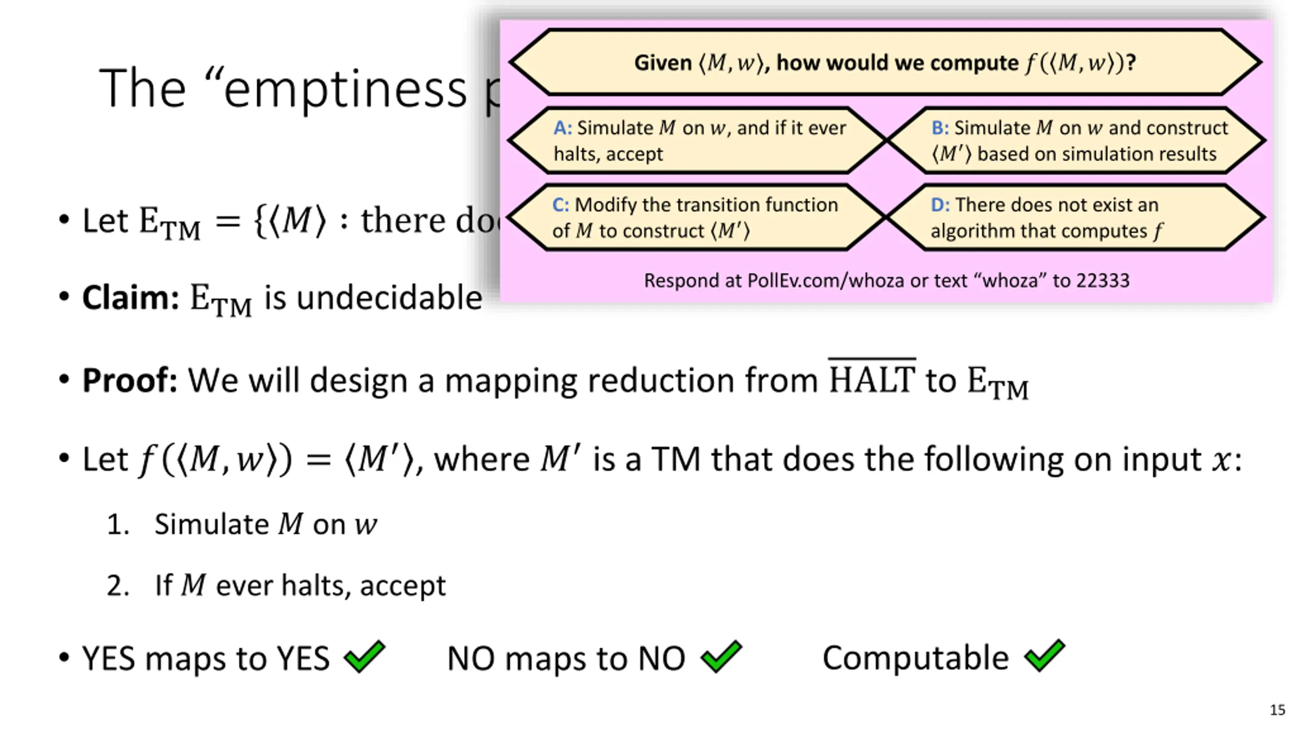Given ?,?, how would we compute ? ?,? ? The emptiness problem A: Simulate ? on ?, and if it ever halts, accept B: Simulate ? on ? and construct ? based on simulation results C: Modify the transition function D: There does not exist an algorithm that computes ? Let ETM= ? there does not exist ? such that ? accepts ? of ? to construct ? Respond at PollEv.com/whoza or text whoza to 22333 Claim: ETM is undecidable Proof: We will design a mapping reduction from HALT to ETM = ? , where ? is a TM that does the following on input ?: Let ? ?,? 1. Simulate ? on ? 2. If ? ever halts, accept YES maps to YES Computable NO maps to NO 15