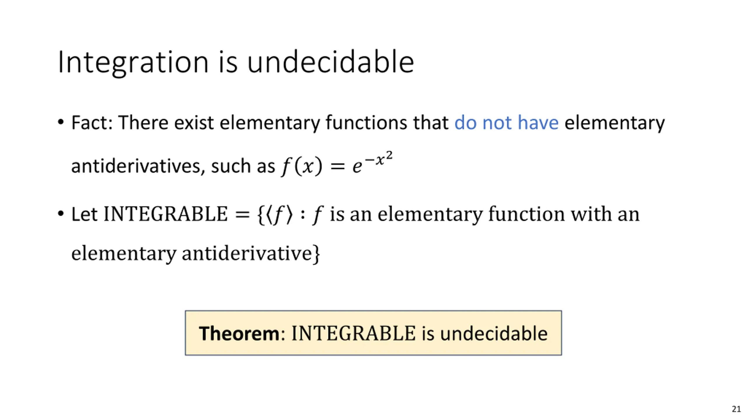 Integration is undecidable Fact: There exist elementary functions that do not have elementary antiderivatives, such as ? ? = ? ?2 Let INTEGRABLE = { ? ? is an elementary function with an elementary antiderivative} Theorem: INTEGRABLE is undecidable 21