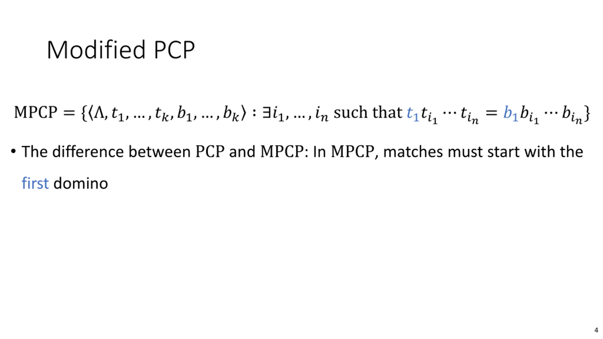 Modified PCP MPCP = { ,?1, ,??,?1, ,?? ?1, ,?? such that ?1??1 ???= ?1??1 ???} The difference between PCP and MPCP: In MPCP, matches must start with the first domino 4