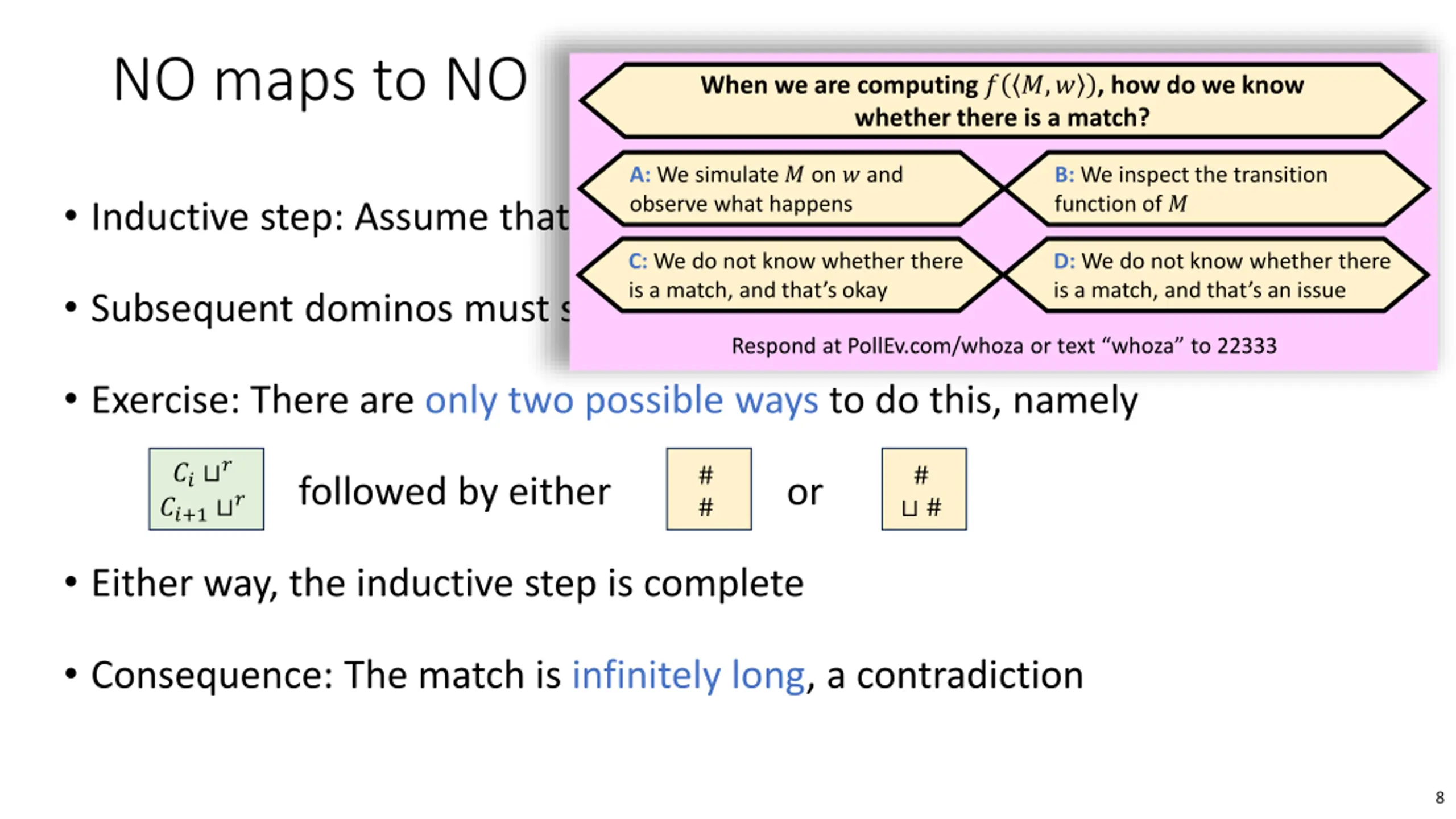 NO maps to NO When we are computing ? ?,? , how do we know whether there is a match? A: We simulate ? on ? and observe what happens B: We inspect the transition function of ? ? Inductive step: Assume that the first ? dominos in the match form C: We do not know whether there is a match, and that s okay ??? ?# D: We do not know whether there is a match, and that s an issue Subsequent dominos must spell out ?? ?# on top Respond at PollEv.com/whoza or text whoza to 22333 Exercise: There are only two possible ways to do this, namely ?? ? # # # followed by either ??+1 ? or # Either way, the inductive step is complete Consequence: The match is infinitely long, a contradiction 8