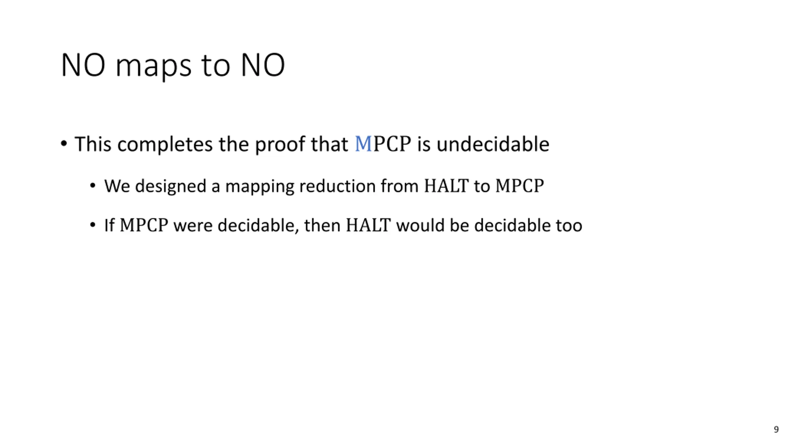 NO maps to NO This completes the proof that MPCP is undecidable We designed a mapping reduction from HALT to MPCP If MPCP were decidable, then HALT would be decidable too 9