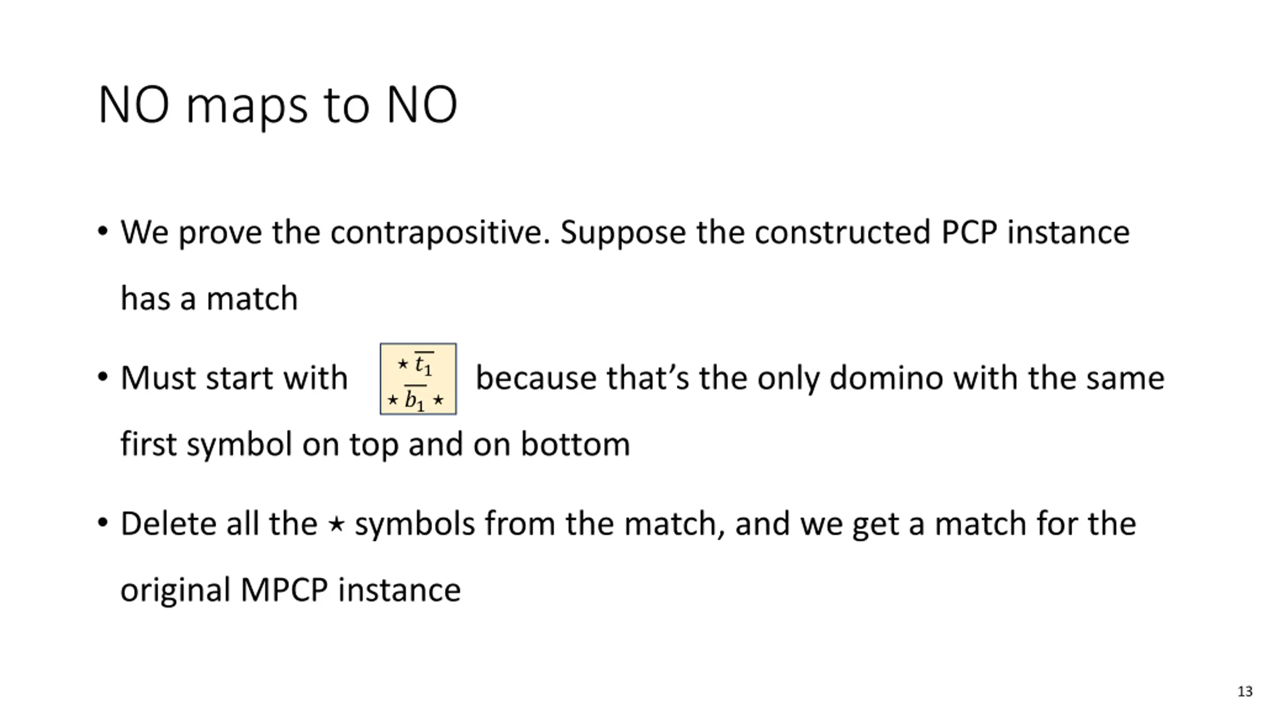 NO maps to NO We prove the contrapositive. Suppose the constructed PCP instance has a match ?1 ?1 Must start with because that s the only domino with the same first symbol on top and on bottom Delete all the symbols from the match, and we get a match for the original MPCP instance 13