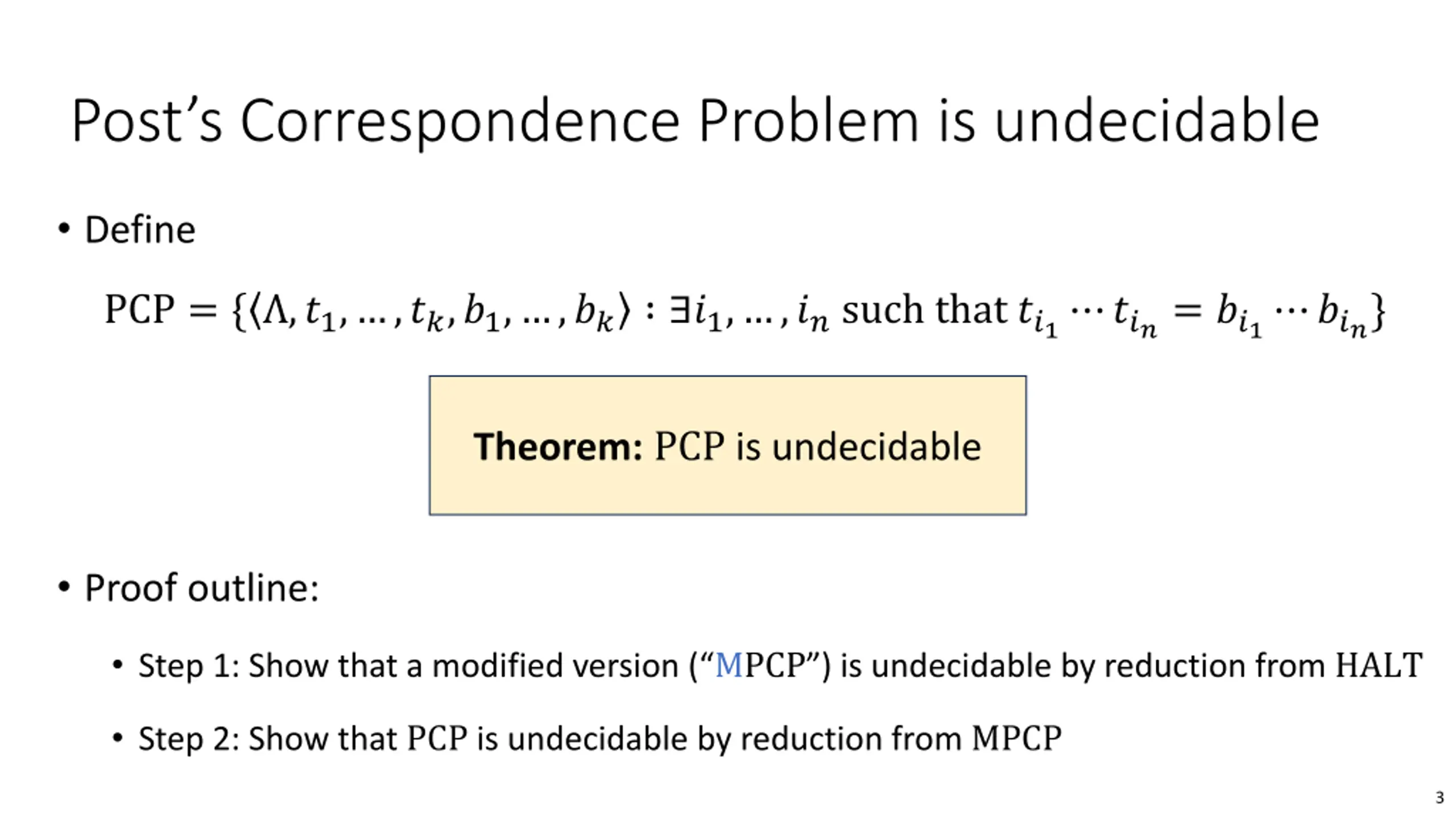 Posts Correspondence Problem is undecidable Define PCP = { ,?1, ,??,?1, ,?? ?1, ,?? such that ??1 ???= ??1 ???} Theorem: PCP is undecidable Proof outline: Step 1: Show that a modified version ( MPCP ) is undecidable by reduction from HALT Step 2: Show that PCP is undecidable by reduction from MPCP 3