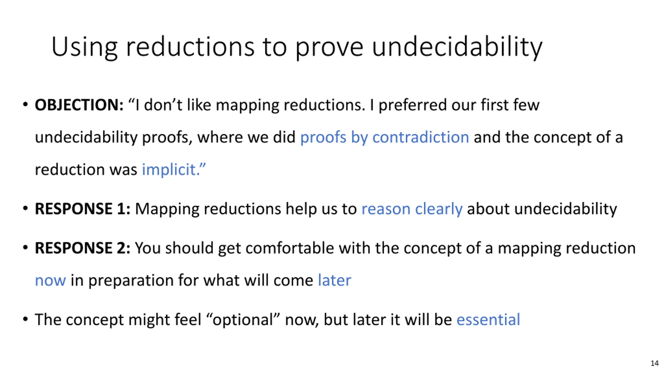Using reductions to prove undecidability OBJECTION: I don t like mapping reductions. I preferred our first few undecidability proofs, where we did proofs by contradiction and the concept of a reduction was implicit. RESPONSE 1: Mapping reductions help us to reason clearly about undecidability RESPONSE 2: You should get comfortable with the concept of a mapping reduction now in preparation for what will come later The concept might feel optional now, but later it will be essential 14