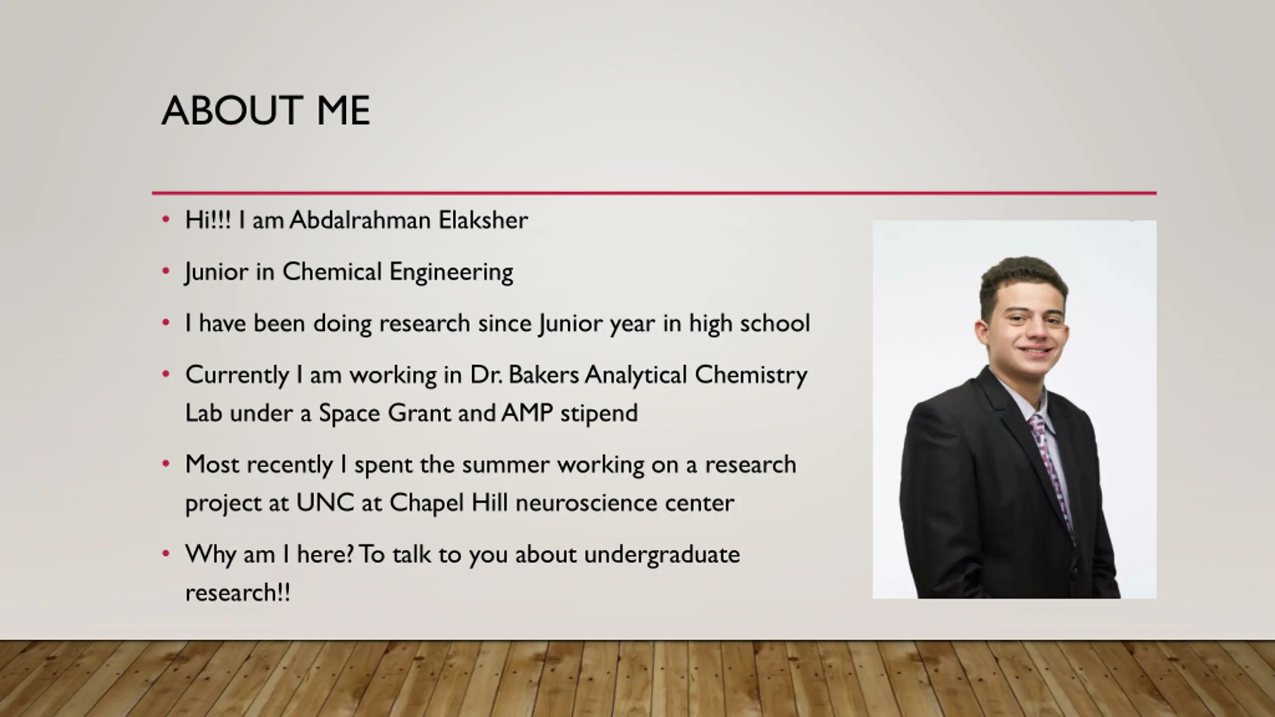ABOUT ME Hi!!! I am Abdalrahman Elaksher Junior in Chemical Engineering I have been doing research since Junior year in high school Currently I am working in Dr. Bakers Analytical Chemistry Lab under a Space Grant and AMP stipend Most recently I spent the summer working on a research project at UNC at Chapel Hill neuroscience center Why am I here? To talk to you about undergraduate research!!