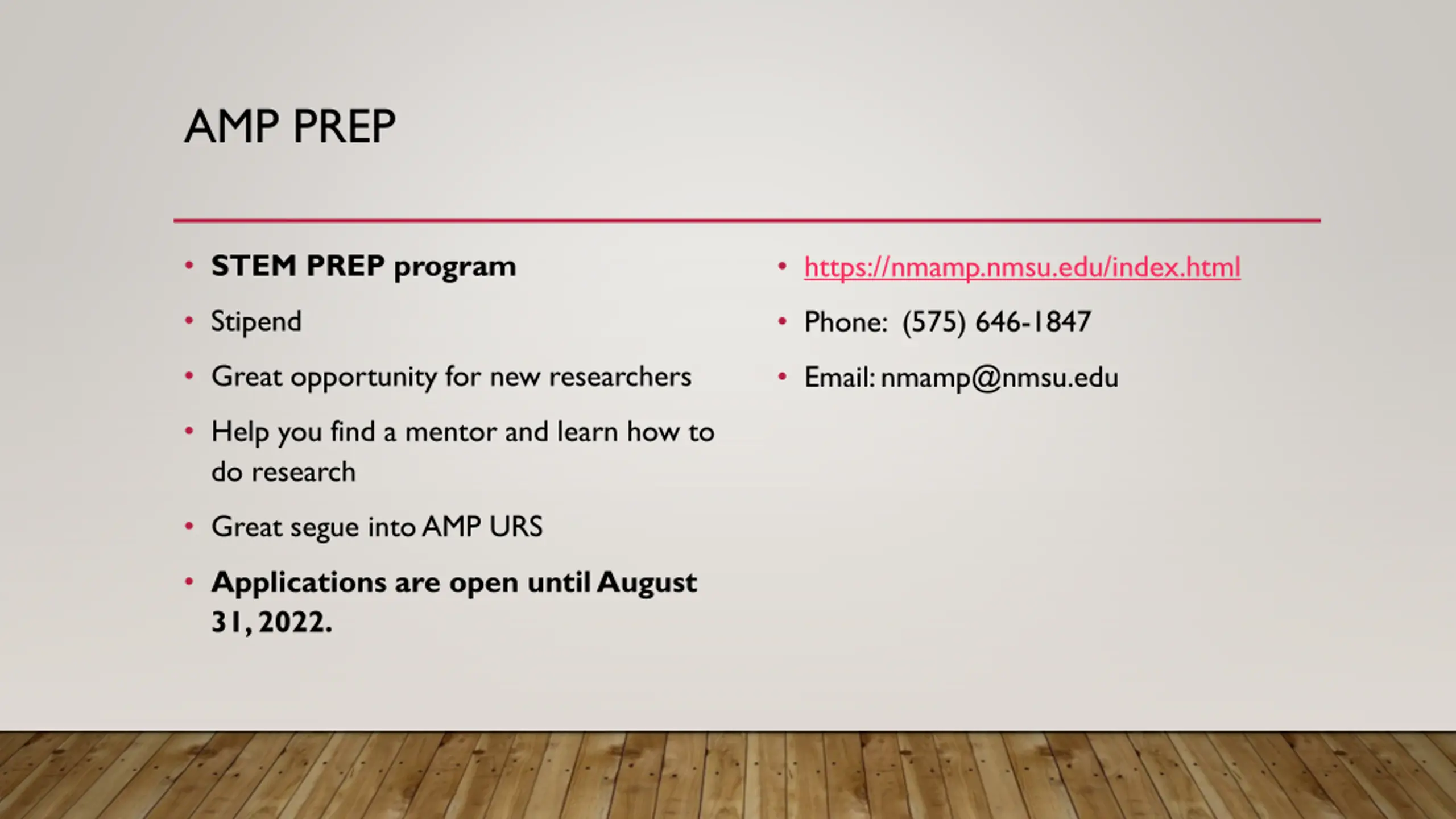 AMP PREP STEM PREP program https://nmamp.nmsu.edu/index.html Stipend Phone: (575) 646-1847 Great opportunity for new researchers Email:nmamp@nmsu.edu Help you find a mentor and learn how to do research Great segue into AMP URS Applications are open until August 31, 2022.