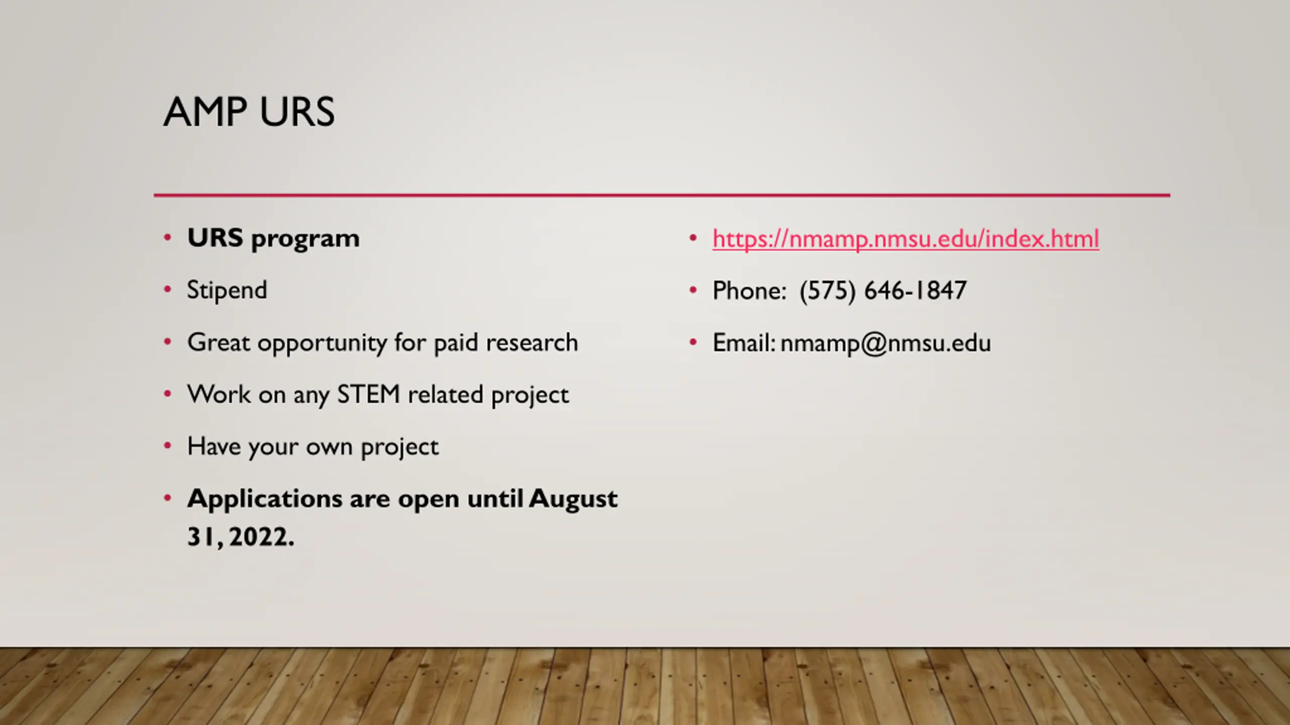 AMP URS URS program https://nmamp.nmsu.edu/index.html Stipend Phone: (575) 646-1847 Great opportunity for paid research Email:nmamp@nmsu.edu Work on any STEM related project Have your own project Applications are open until August 31, 2022.