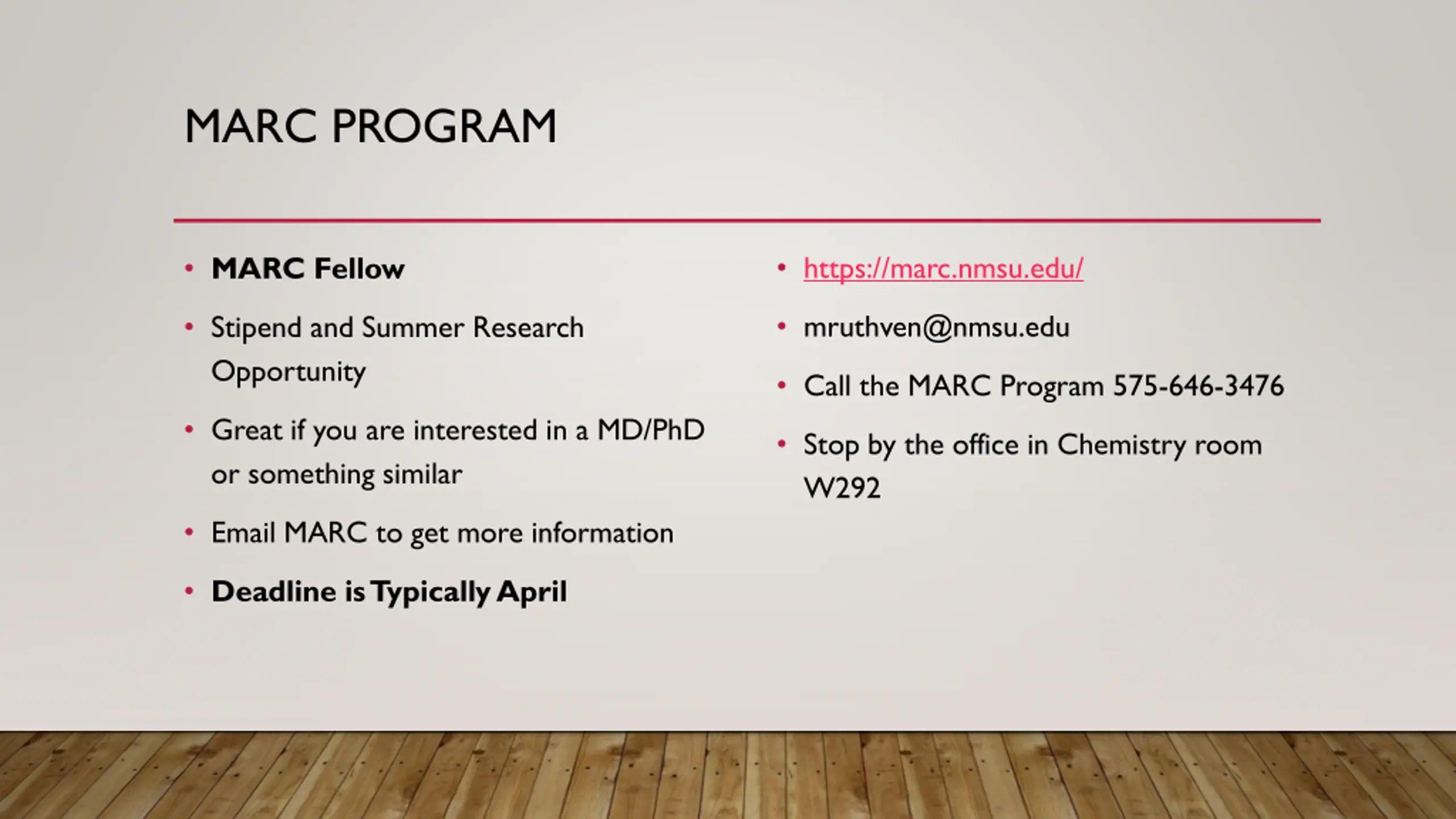 MARC PROGRAM https://marc.nmsu.edu/ MARC Fellow mruthven@nmsu.edu Stipend and Summer Research Opportunity Call the MARC Program 575-646-3476 Great if you are interested in a MD/PhD or something similar Stop by the office in Chemistry room W292 Email MARC to get more information Deadline is Typically April