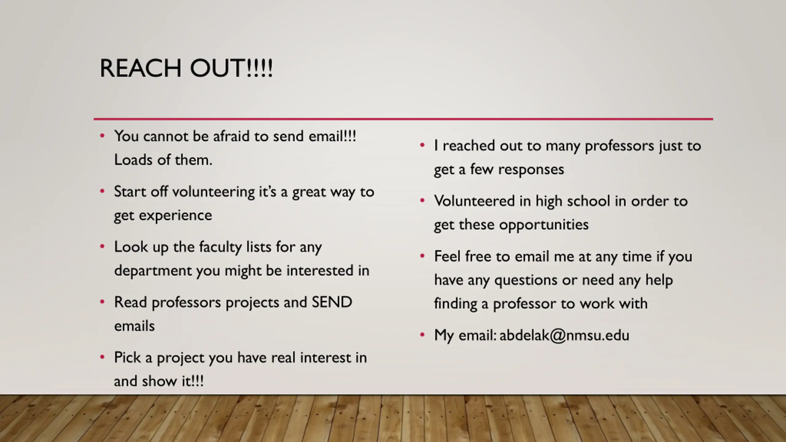 REACH OUT!!!! You cannot be afraid to send email!!! Loads of them. I reached out to many professors just to get a few responses Start off volunteering it s a great way to get experience Volunteered in high school in order to get these opportunities Look up the faculty lists for any department you might be interested in Feel free to email me at any time if you have any questions or need any help finding a professor to work with Read professors projects and SEND emails My email: abdelak@nmsu.edu Pick a project you have real interest in and show it!!!