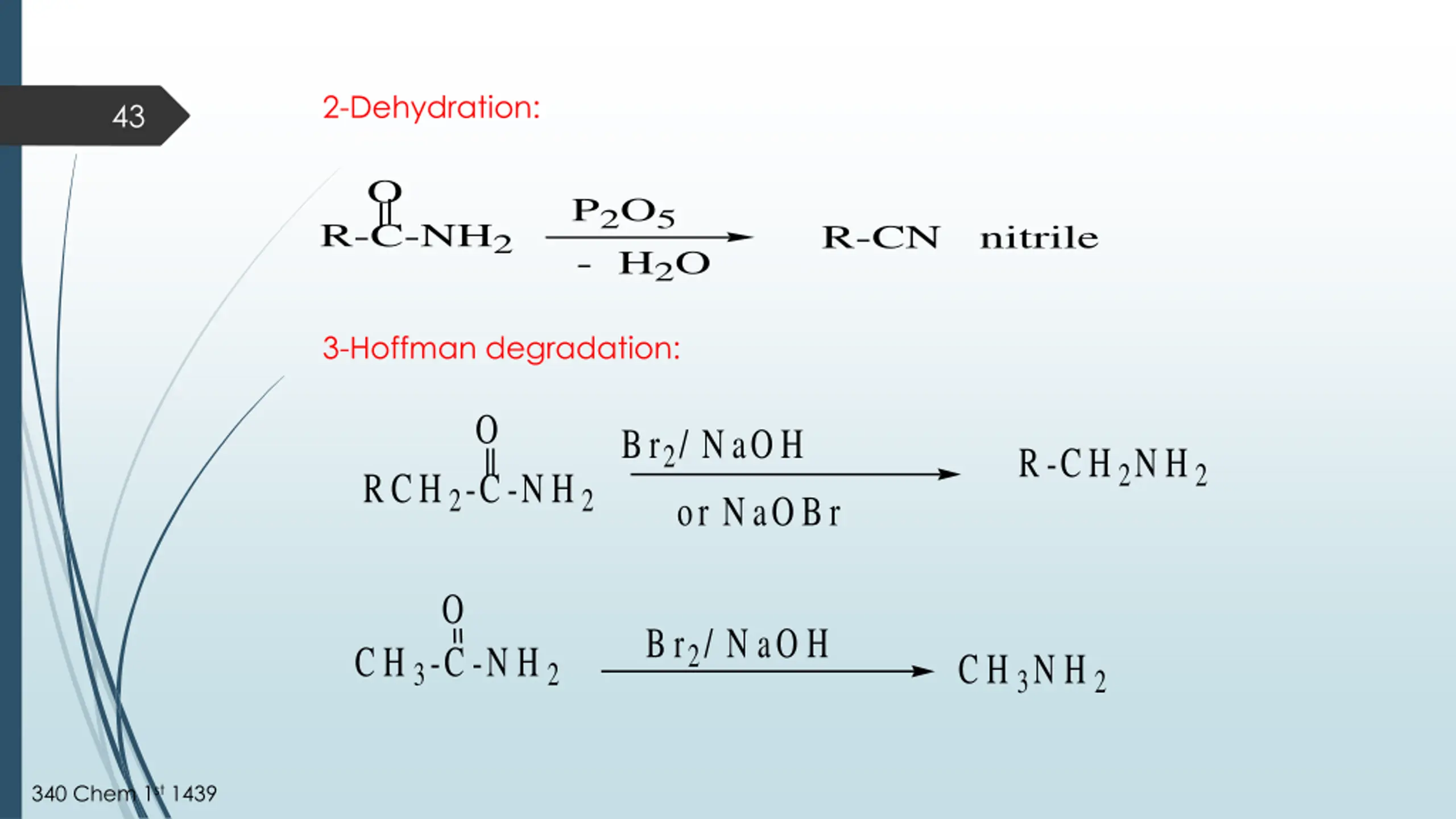 2-Dehydration: 43 O P2O5 - H2O R-C-NH2 R-CN nitrile 3-Hoffman degradation: O Br2/ N aO H or N aO Br R-CH2N H2 RCH2-C-N H2 O B r2/ N aO H C H3-C -N H2 C H3N H2 340 Chem 1st 1439