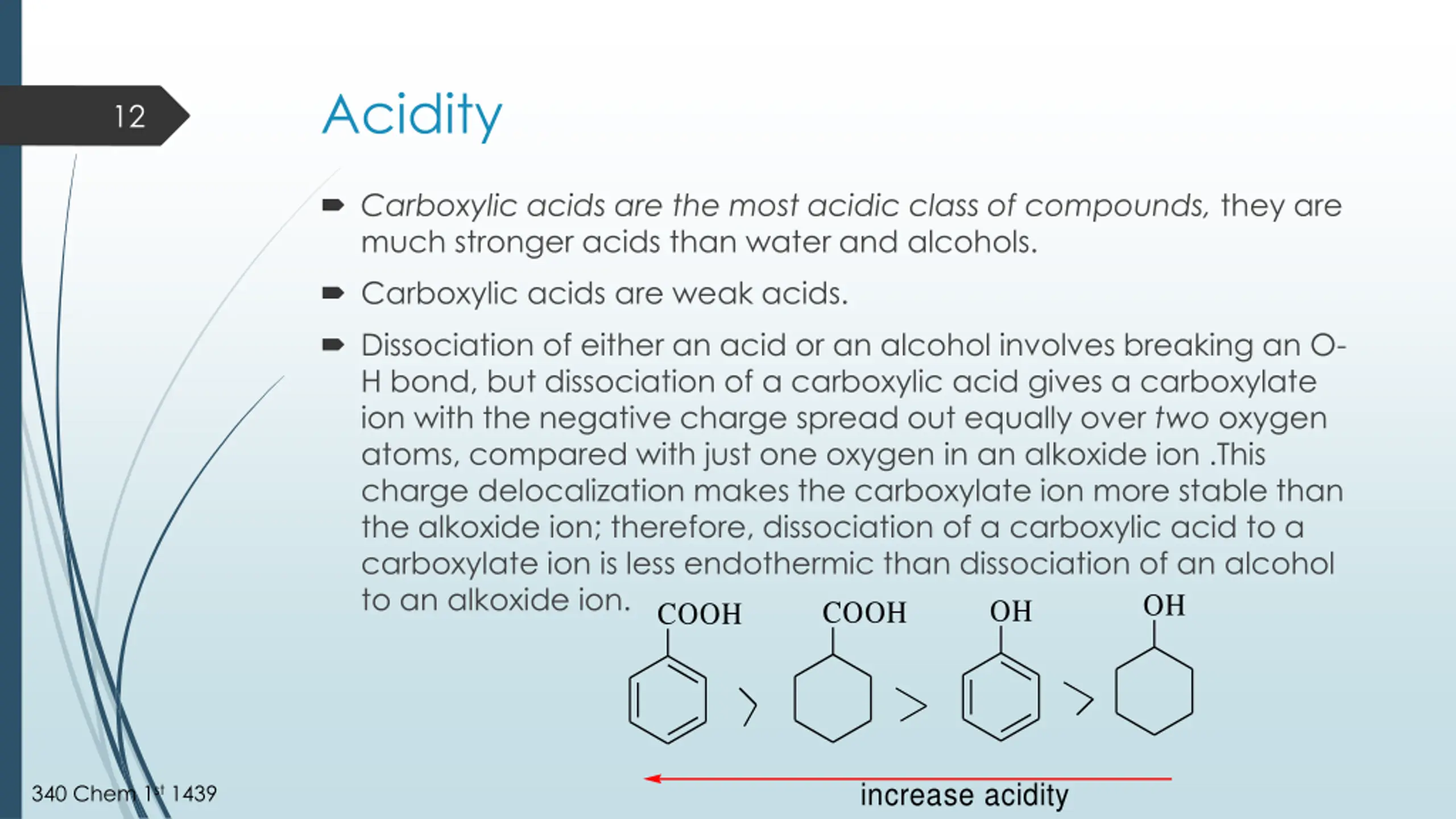 Acidity 12 Carboxylic acids are the most acidic class of compounds, they are much stronger acids than water and alcohols. Carboxylic acids are weak acids. Dissociation of either an acid or an alcohol involves breaking an O- H bond, but dissociation of a carboxylic acid gives a carboxylate ion with the negative charge spread out equally over two oxygen atoms, compared with just one oxygen in an alkoxide ion .This charge delocalization makes the carboxylate ion more stable than the alkoxide ion; therefore, dissociation of a carboxylic acid to a carboxylate ion is less endothermic than dissociation of an alcohol to an alkoxide ion. COOH COOH OH OH increase acidity 340 Chem 1st 1439
