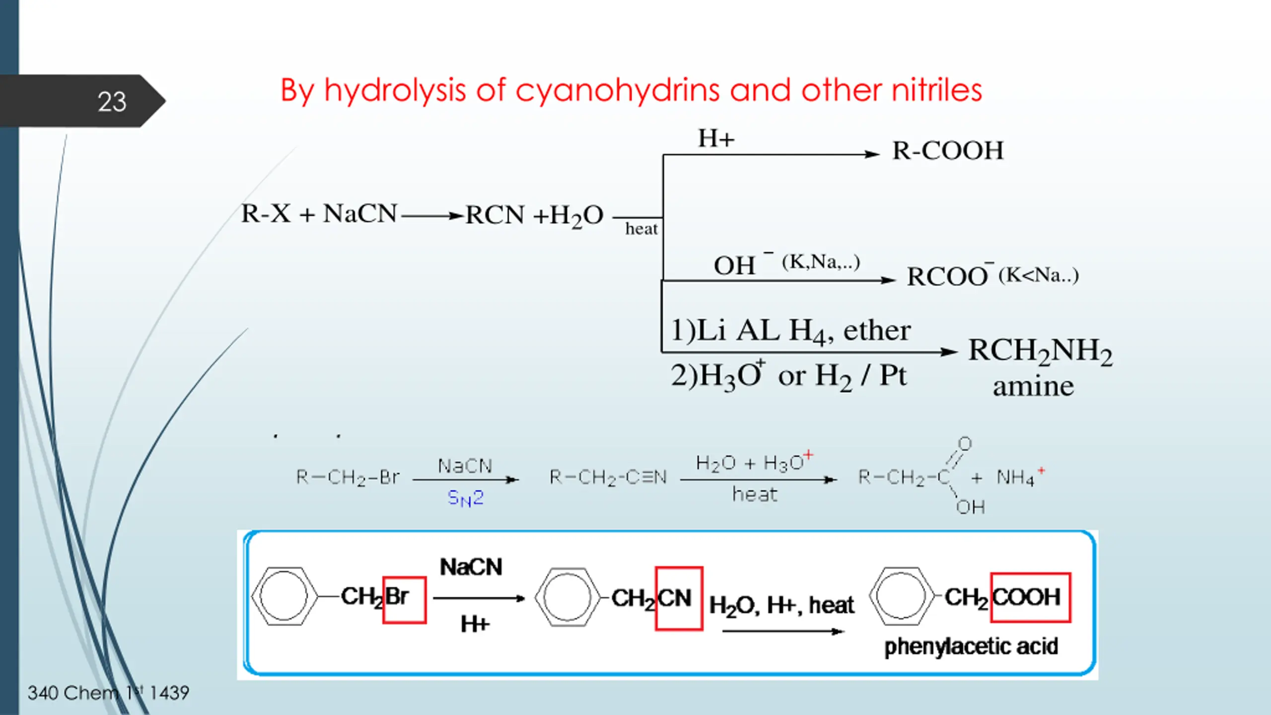 By hydrolysis of cyanohydrins and other nitriles 23 H+ R-COOH R-X + NaCN RCN +H2O heat (K,Na,..) OH RCOO (K<Na..) 1)Li AL H4, ether 2)H3O or H2 / Pt RCH2NH2 amine 340 Chem 1st 1439
