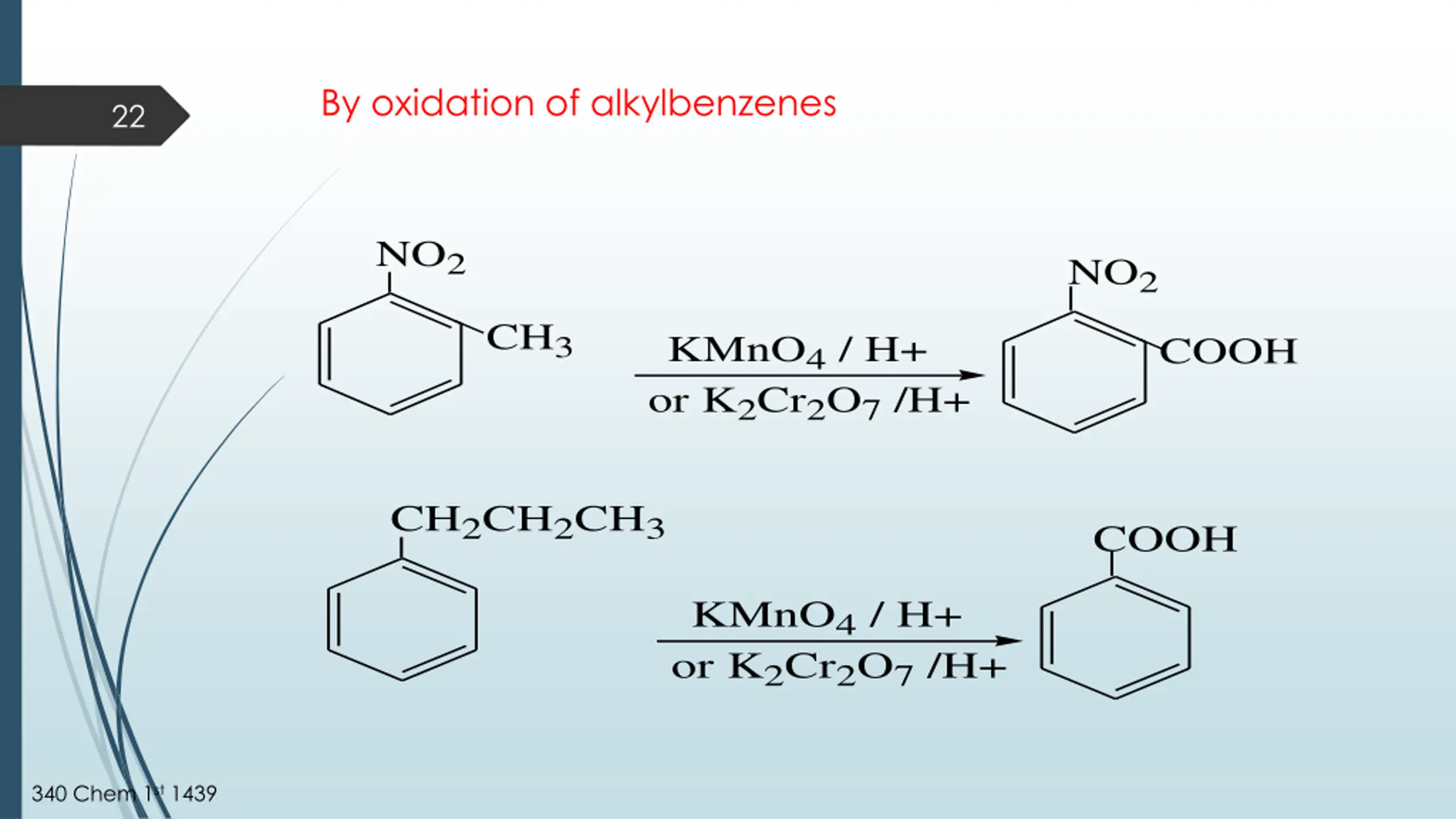 By oxidation of alkylbenzenes 22 NO2 NO2 CH3 KMnO4 / H+ or K2Cr2O7 /H+ COOH CH2CH2CH3 COOH KMnO4 / H+ or K2Cr2O7 /H+ 340 Chem 1st 1439