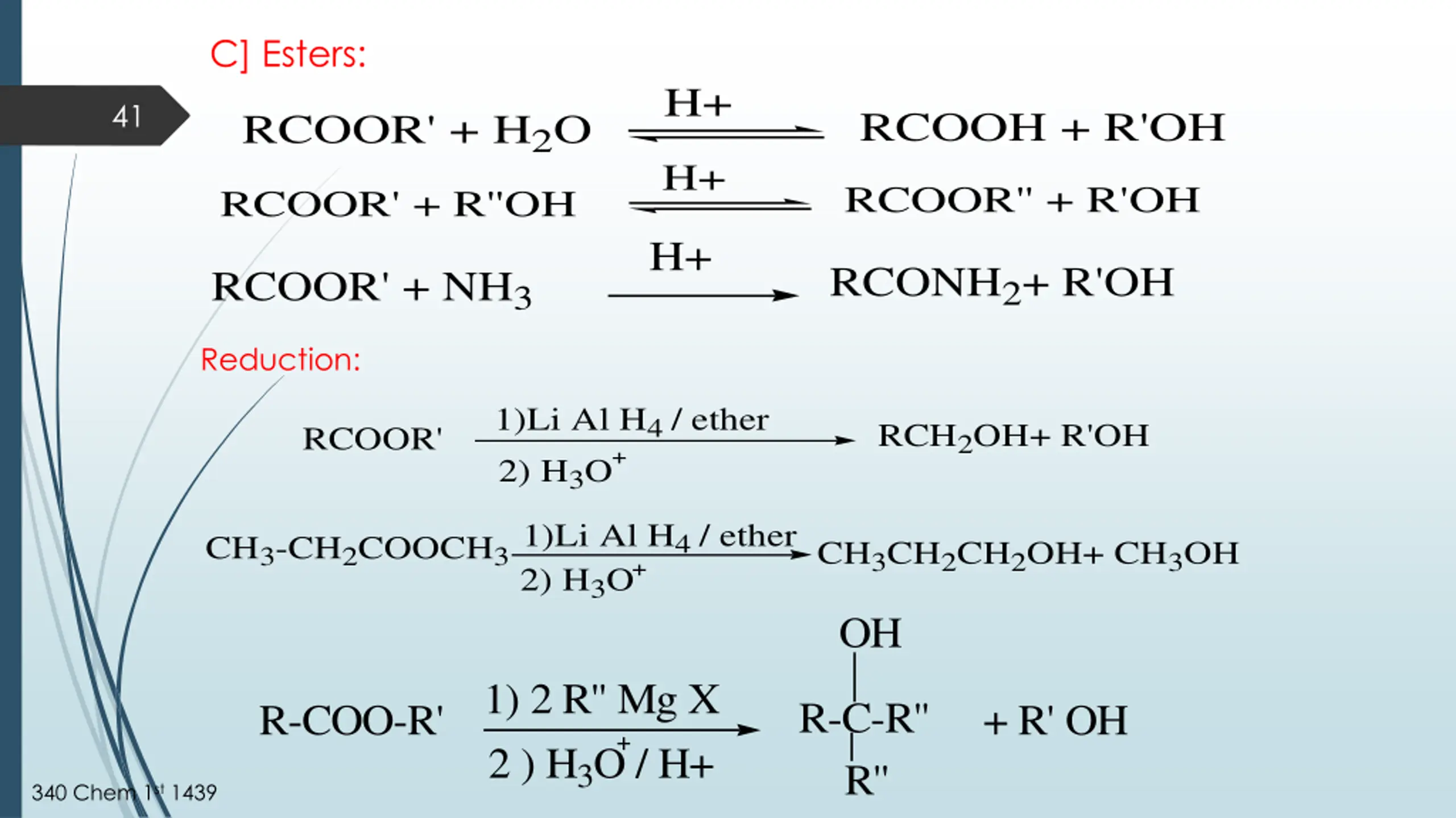 C] Esters: H+ 41 RCOOH + R'OH RCOOR' + H2O H+ RCOOR'' + R'OH RCOOR' + R''OH H+ RCONH2+ R'OH RCOOR' + NH3 Reduction: 1)Li Al H4 / ether 2) H3O RCH2OH+ R'OH RCOOR' 1)Li Al H4 / ether 2) H3O CH3-CH2COOCH3 CH3CH2CH2OH+ CH3OH OH 1) 2 R'' Mg X 2 ) H3O / H+ R-C-R'' R'' R-COO-R' + R' OH 340 Chem 1st 1439