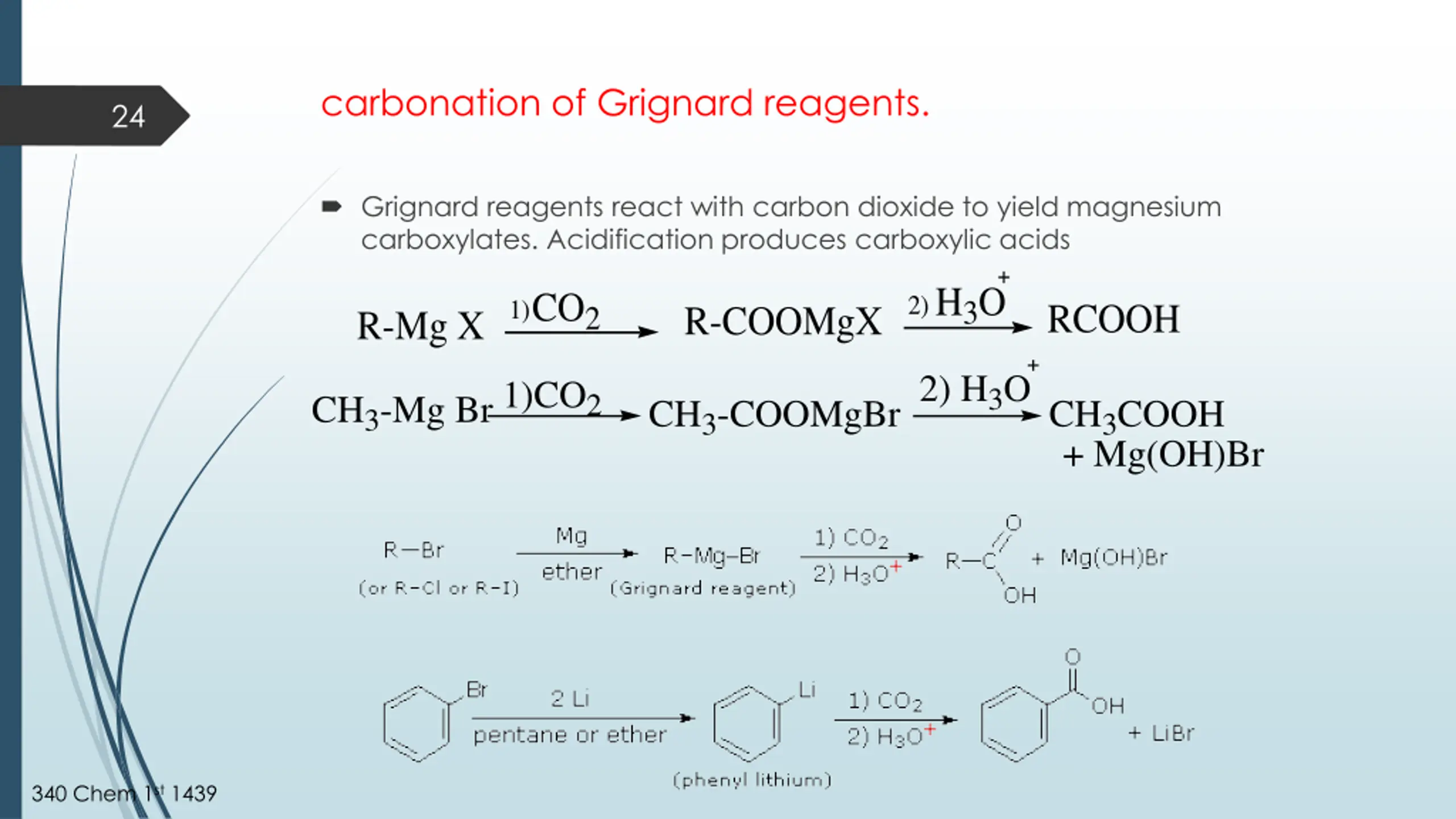 carbonation of Grignard reagents. 24 Grignard reagents react with carbon dioxide to yield magnesium carboxylates. Acidification produces carboxylic acids H3O CO2 2) 1) RCOOH R-COOMgX R-Mg X CH3-COOMgBr2) H3OCH3COOH 1)CO2 CH3-Mg Br + Mg(OH)Br 340 Chem 1st 1439