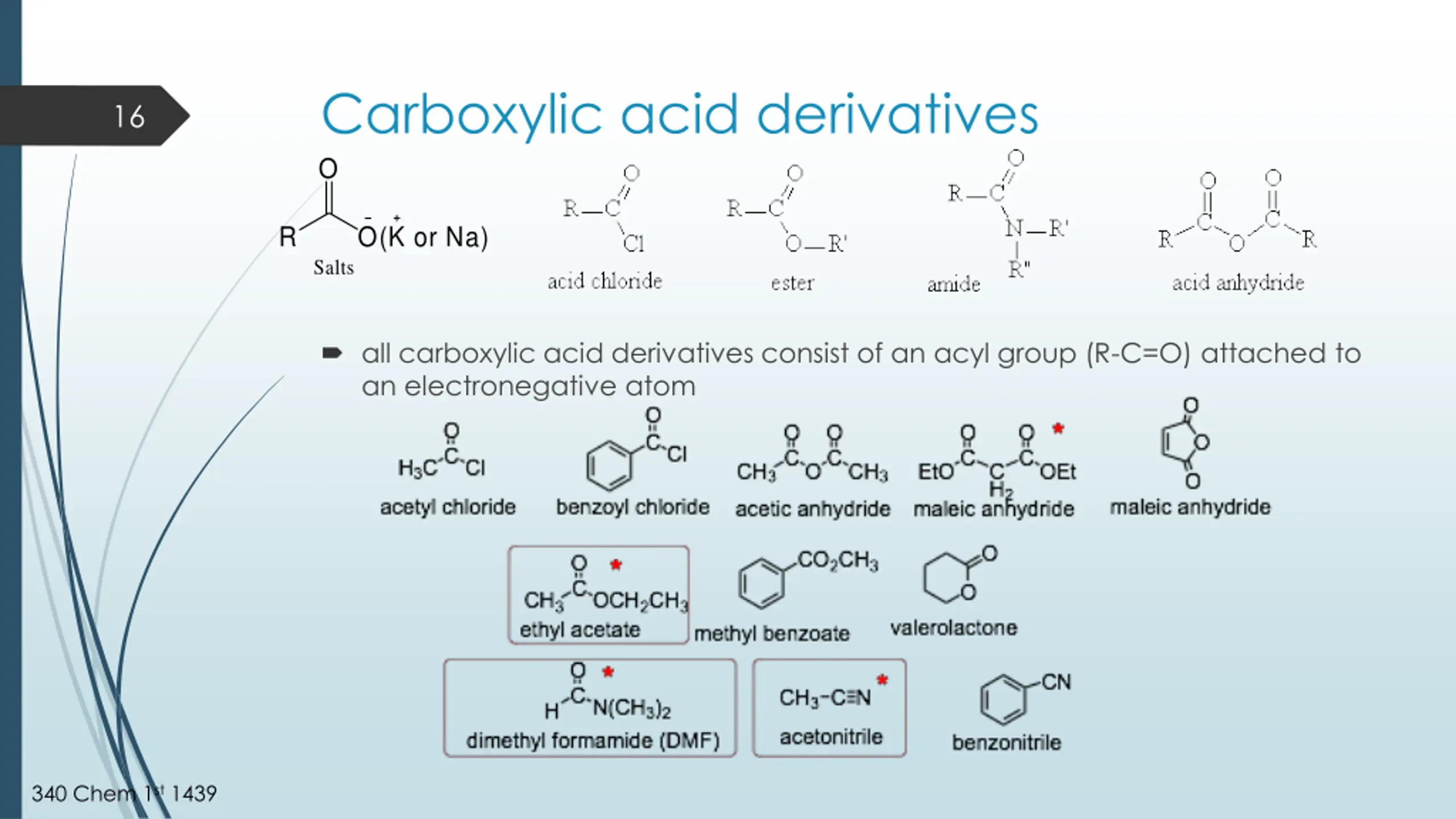 Carboxylic acid derivatives O 16 R O(K or Na) Salts all carboxylic acid derivatives consist of an acyl group (R-C=O) attached to an electronegative atom 340 Chem 1st 1439