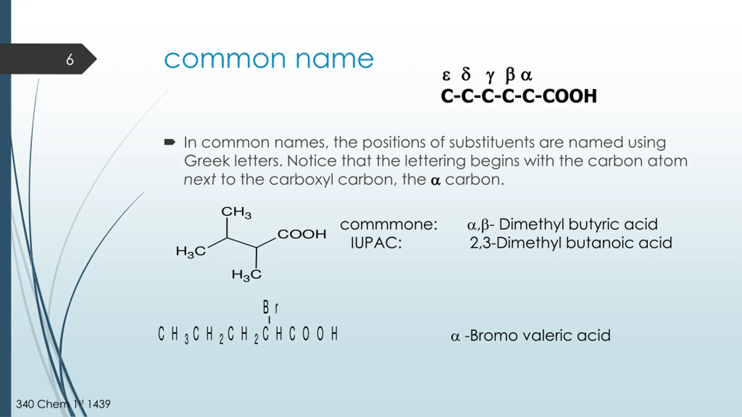 common name 6 C-C-C-C-C-COOH In common names, the positions of substituents are named using Greek letters. Notice that the lettering begins with the carbon atom next to the carboxyl carbon, the carbon. CH3 commmone: , - Dimethyl butyric acid IUPAC: 2,3-Dimethyl butanoic acid C H3 C H3 COOH B r C H3C H2C H2C H C O O H -Bromo valeric acid 340 Chem 1st 1439