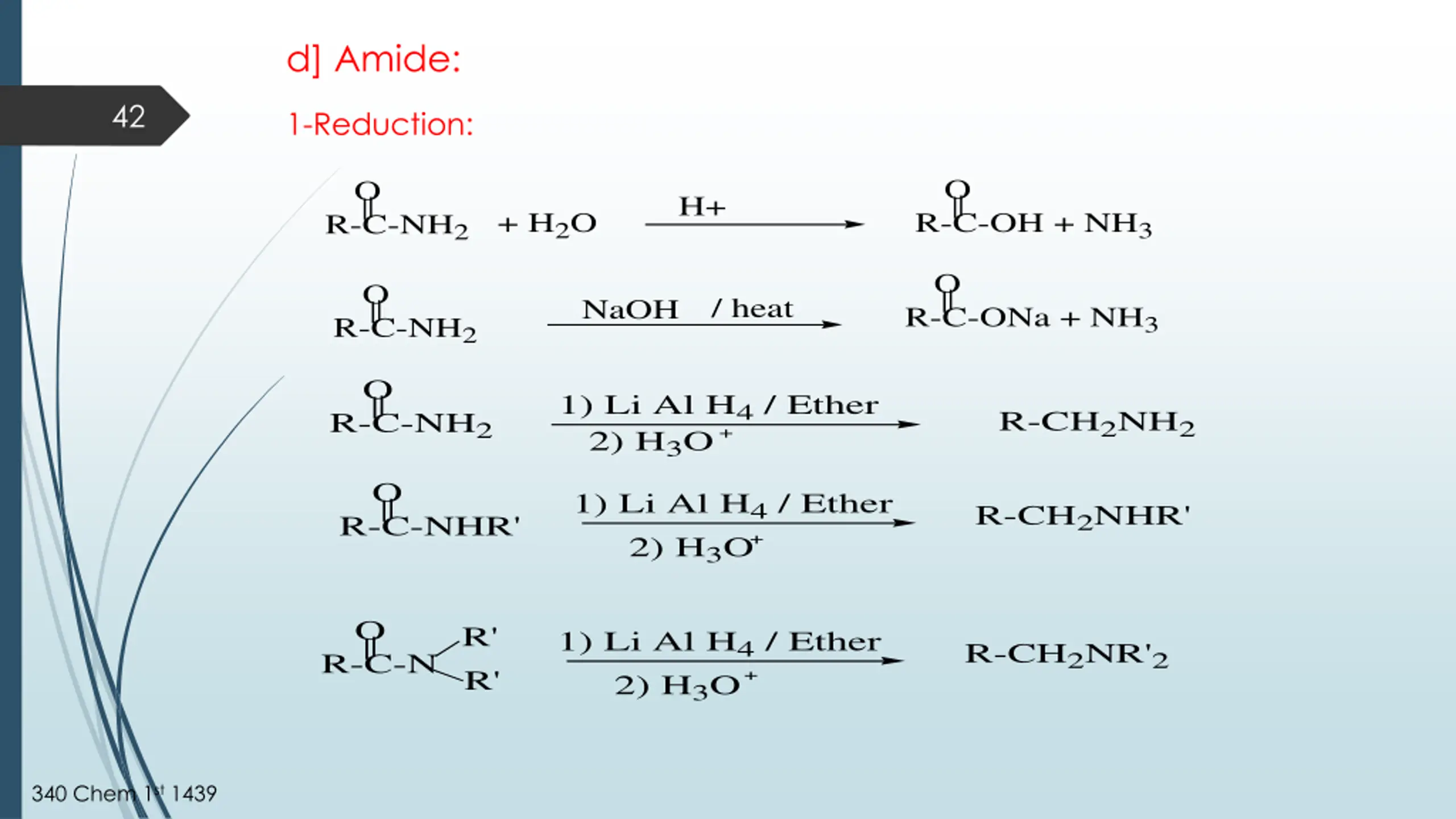 d] Amide: 42 1-Reduction: O O H+ + H2O R-C-OH + NH3 R-C-NH2 O O / heat NaOH R-C-ONa + NH3 R-C-NH2 O 1) Li Al H4 / Ether 2) H3O R-CH2NH2 R-C-NH2 O 1) Li Al H4 / Ether 2) H3O R-CH2NHR' R-C-NHR' O R' R' 1) Li Al H4 / Ether 2) H3O R-CH2NR'2 R-C-N 340 Chem 1st 1439