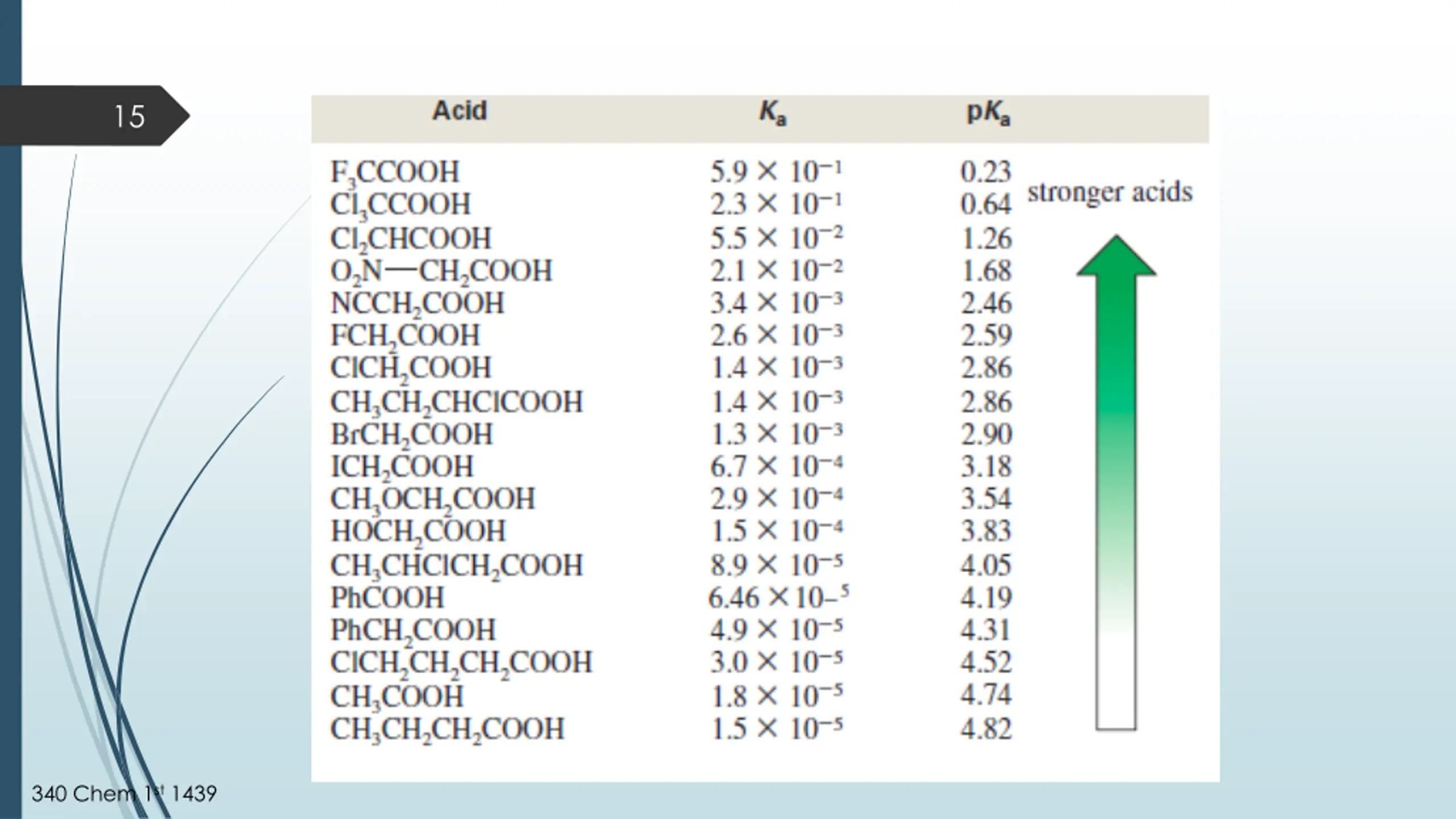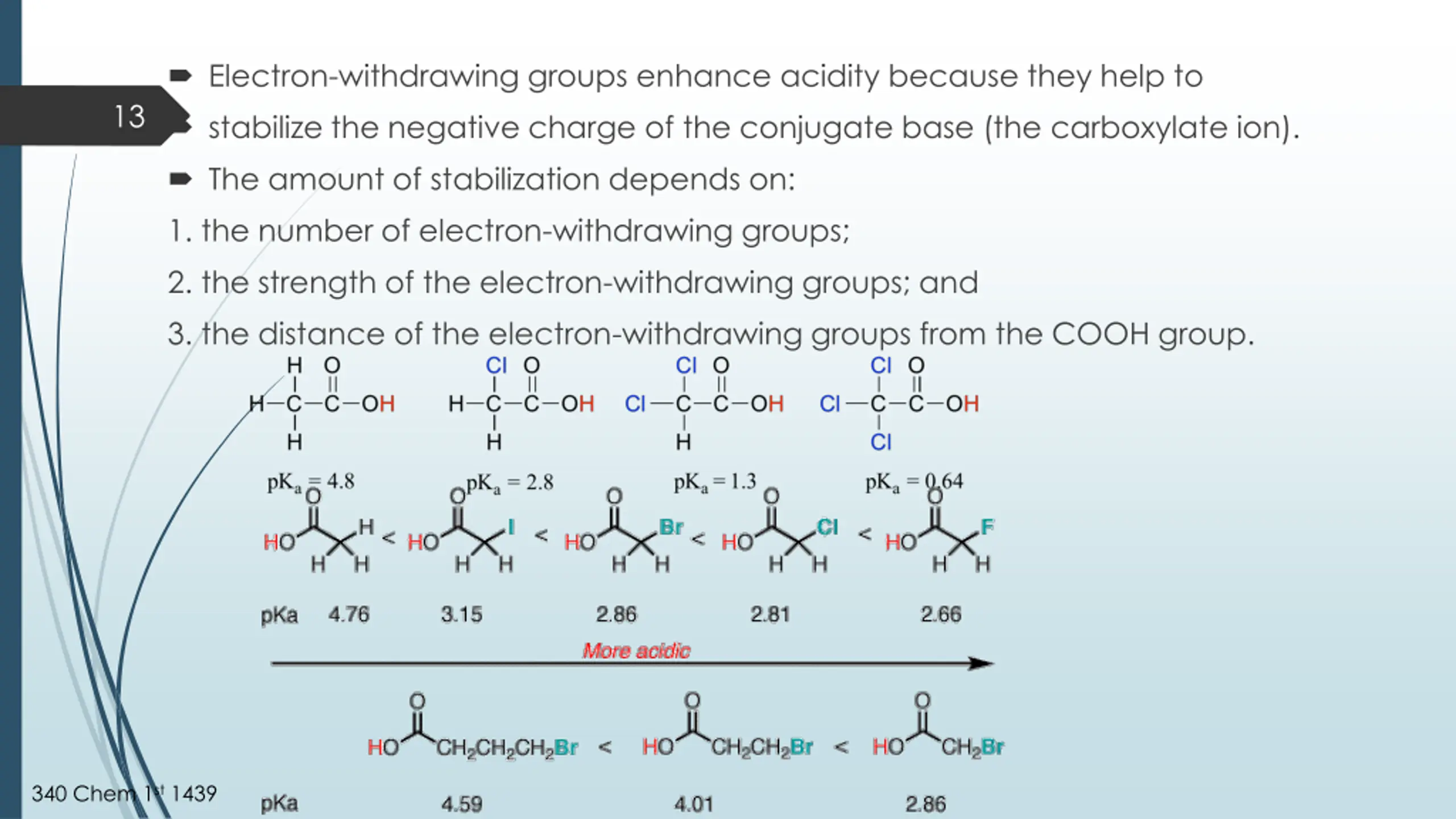 Electron-withdrawing groups enhance acidity because they help to stabilize the negative charge of the conjugate base (the carboxylate ion). The amount of stabilization depends on: 1. the number of electron-withdrawing groups; 2. the strength of the electron-withdrawing groups; and 3. the distance of the electron-withdrawing groups from the COOH group. 13 340 Chem 1st 1439