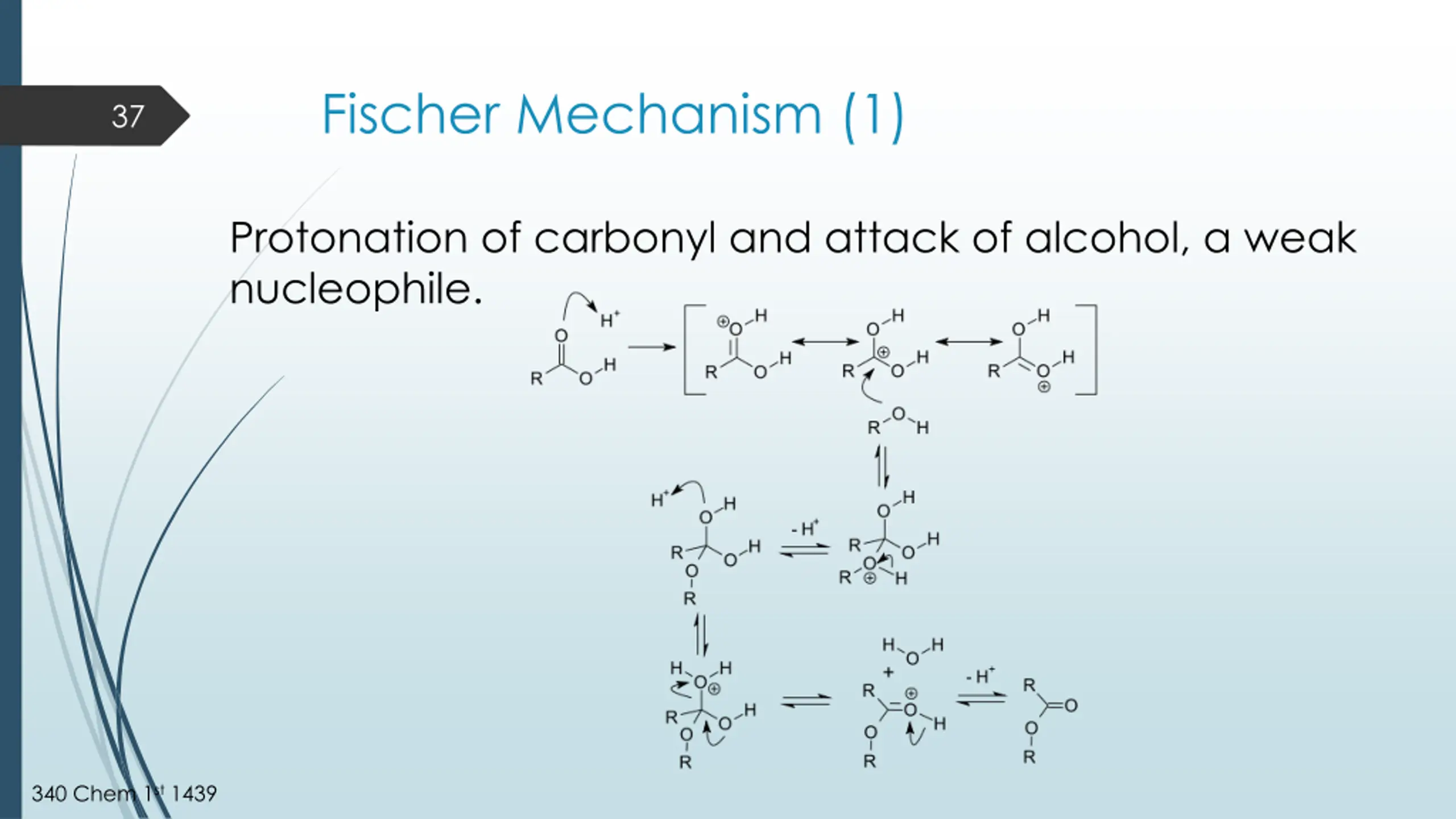 Fischer Mechanism (1) 37 Protonation of carbonyl and attack of alcohol, a weak nucleophile. 340 Chem 1st 1439