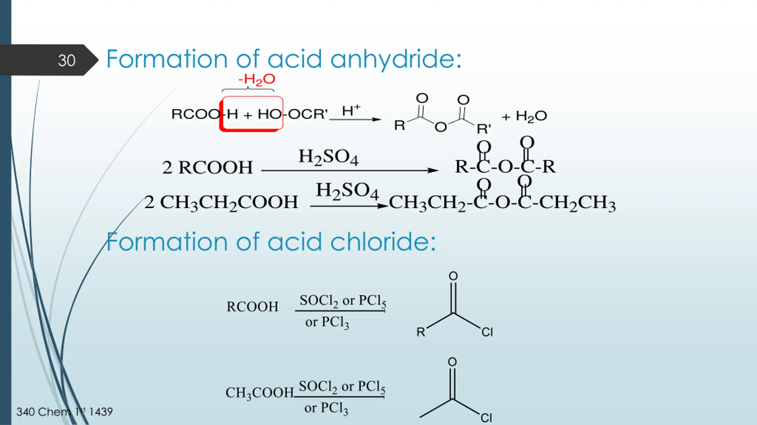 Formation of acid anhydride: -H2O 30 O O H+ RCOO-H + HO-OCR' + H2O R O R' O O H2SO4 R-C-O-C-R O 2 RCOOH O H2SO4 2 CH3CH2COOH Formation of acid chloride: CH3CH2-C-O-C-CH2CH3 340 Chem 1st 1439