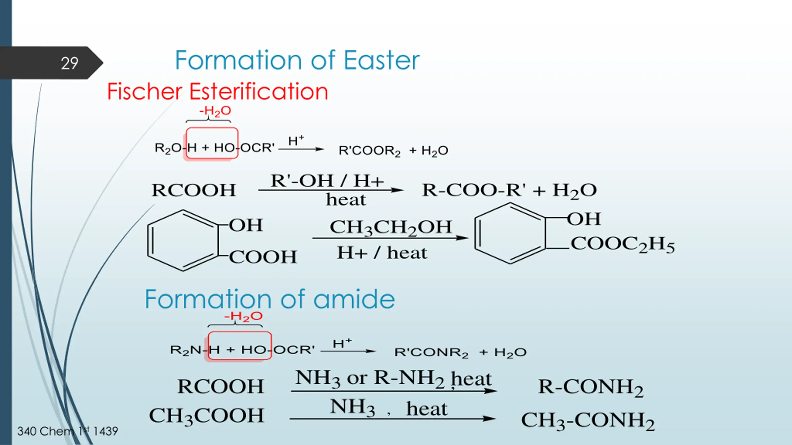 Formation of Easter Fischer Esterification 29 R'-OH / H+ heat R-COO-R' + H2O RCOOH OH COOC2H5 OH CH3CH2OH H+ / heat COOH Formation of amide NH3 or R-NH2 ,heat NH3 , RCOOH CH3COOH R-CONH2 CH3-CONH2 heat 340 Chem 1st 1439