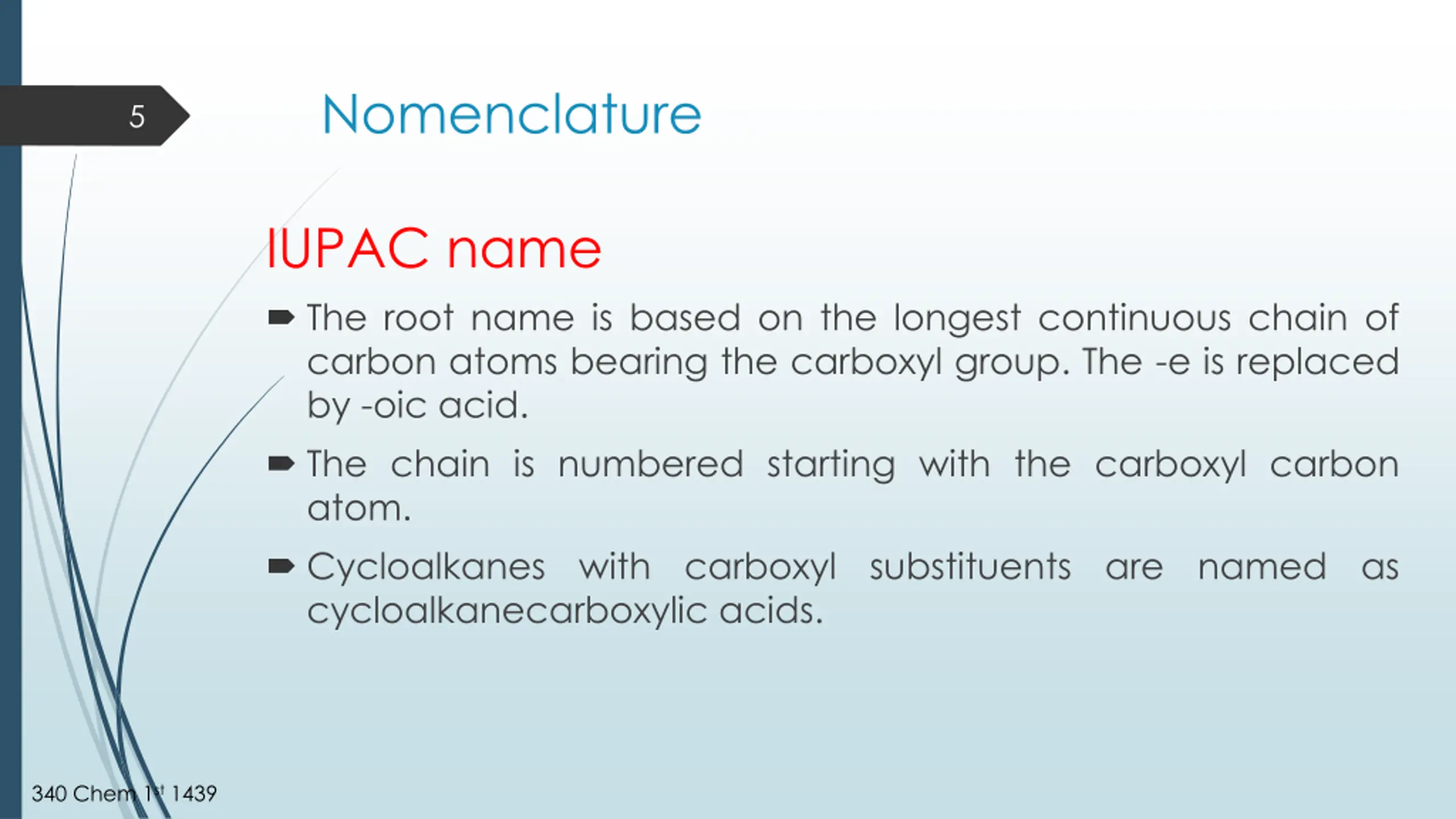 Nomenclature 5 IUPAC name The root name is based on the longest continuous chain of carbon atoms bearing the carboxyl group. The -e is replaced by -oic acid. The chain is numbered starting with the carboxyl carbon atom. Cycloalkanes with carboxyl substituents are named as cycloalkanecarboxylic acids. 340 Chem 1st 1439